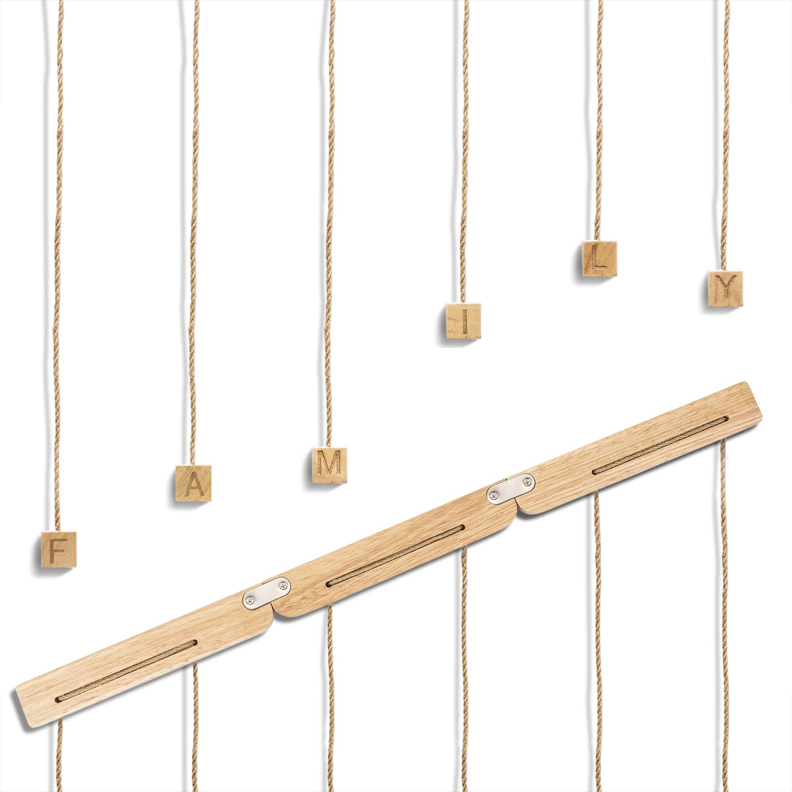 "Functional & Smart: Flexible length adjustment of 3 clotheslines, double-sided tape on wooden cubes with letter for straight attachment of the lines to the wall",