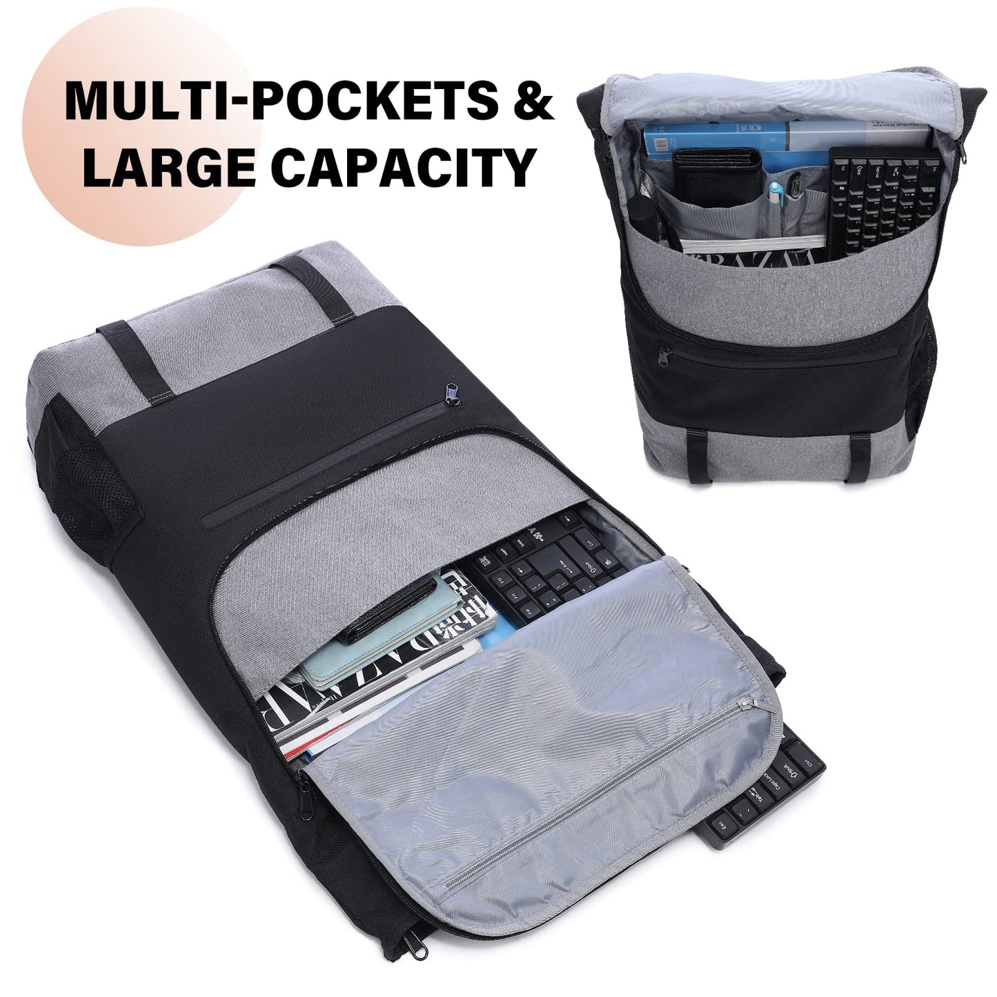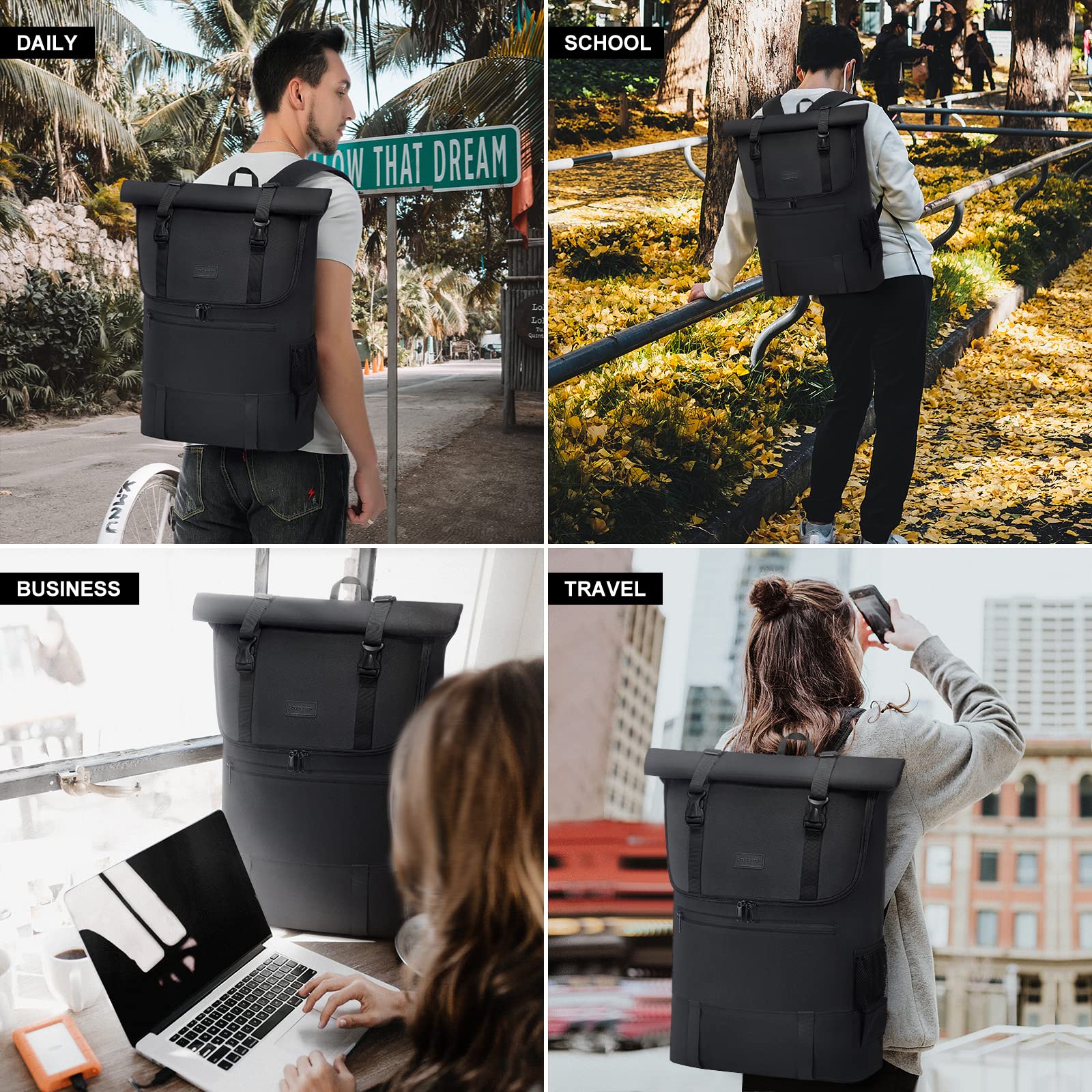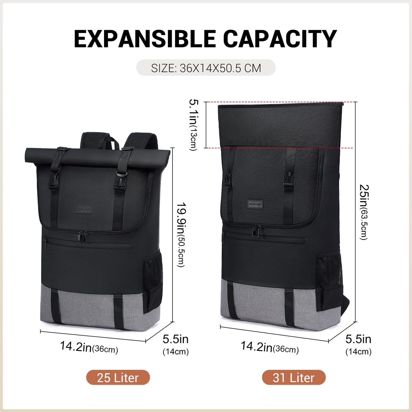 ["Large Capacity - Rolltop Laptop Backpack: Dimensions: 14.2 x 5.5 x 19.9 inches. Extended Size: 14.2 x 5.5 x 25 inches, Capacity: 25L-32L. Separate zippers on the front and top of the backpack, and large openings make it easy to organize your belongings.","Multi-pocket Design: This laptop backpack for men and women features a spacious main compartment with 4 pockets and an inner pocket for water bottles. Enough to store your daily essentials and keep them organized. In addition, the back of the backpack has a padded computer compartment with a separate zipper that can effectively protect your 14", 15.6", 17", 17.3" laptop, MacBook, and iPads.","Comfortable Shoulder Strap Design: The padded shoulder straps ease the strain on your shoulders, and the adjustable chest straps help balance the weight of the backpack and reduce shoulder strain. In addition, the chest strap can help stabilize the roll top backpack on your back.","Unique Design: The back of the work bag is equipped with an independent anti-theft pocket that can protect your valuables. The luggage strap design on the back of the backpack frees your hands and securely attaches it to your suitcase.","Multifunctional Laptop Backpack: This stylish backpack is suitable for many occasions: work, business, university, shopping, travel, etc. This backpack makes a perfect gift for friends, family, teachers, etc."]