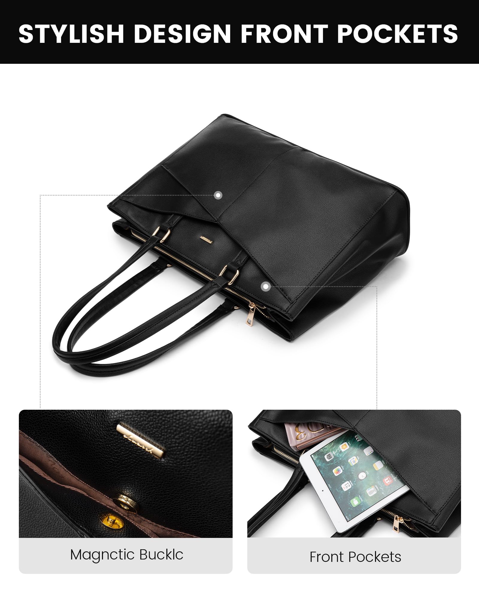 ["High-quality laptop bag made of durable material】This bag is made of durable, water- and scratch-resistant synthetic material and dense polyester. The additional four dustproof feet on the bottom not only ensure cleanliness but also provide enhanced protection against wear and tear.","【Dimensions & Practical, stylish handbag】Size: 42x15.5x28 cm; Weight: 2 lbs. The minimalist design is suitable for work and leisure. Matches casual and formal attire as well as high heels or flat shoes.","【Large capacity laptop bag for women】Specially designed for 15.6-inch laptops and smaller models. Thick padding and a Velcro closure secure the laptop and tablet. Perfect size for all the essentials.","【Well-thought-out compartment design】The laptop bag features double magnet pockets in the front, a padded laptop and iPad compartment, 2 slip pockets, 2 pen slots, and a back anti-theft pocket. Keeps everything organized.","【Stylish and lightweight】This leather bag is perfect as a laptop or work bag. Ideal for work, business trips, meetings, shopping, or daily use. A great gift idea for women on birthdays, Valentine's Day, Mother's Day, Christmas, or graduation."]
