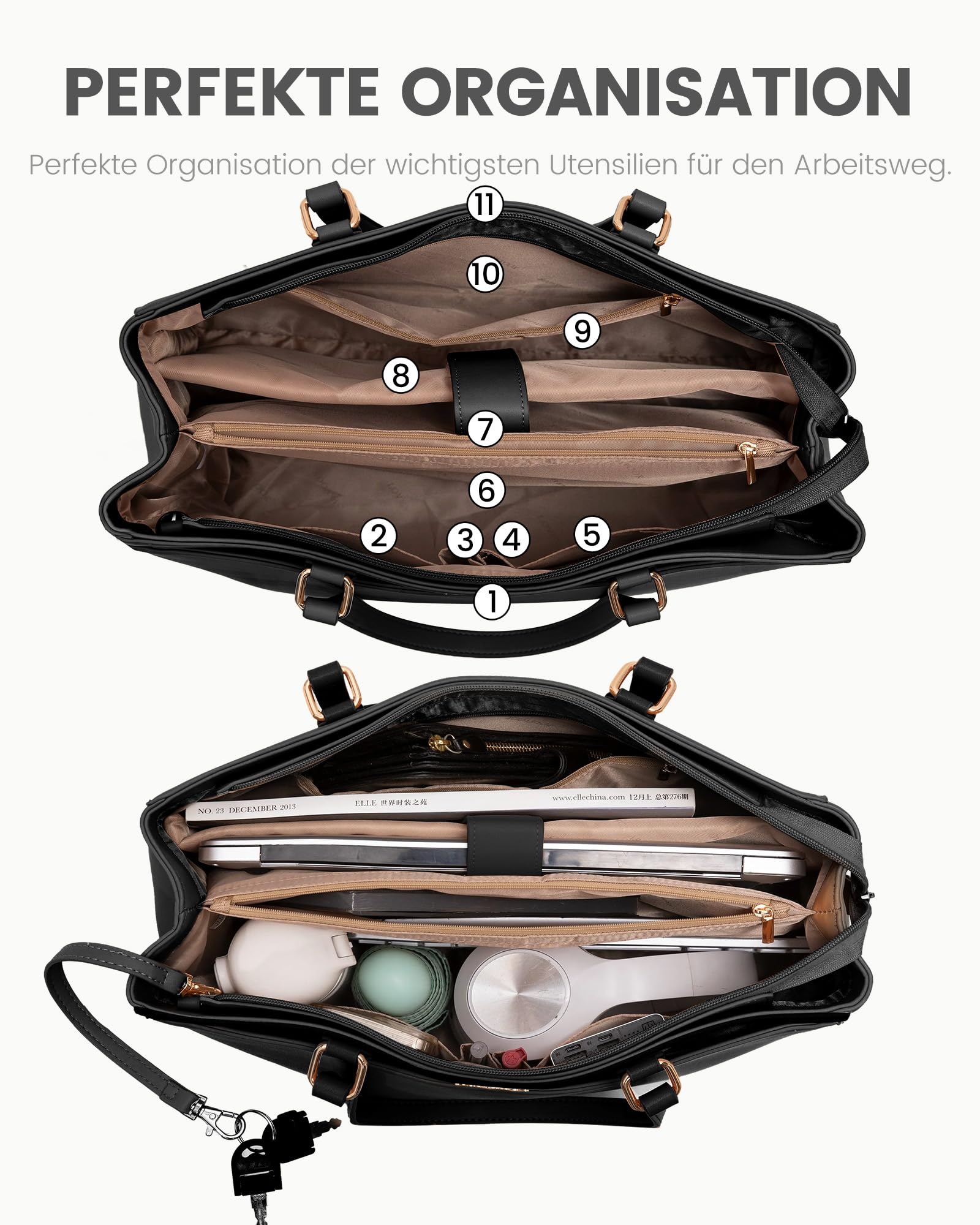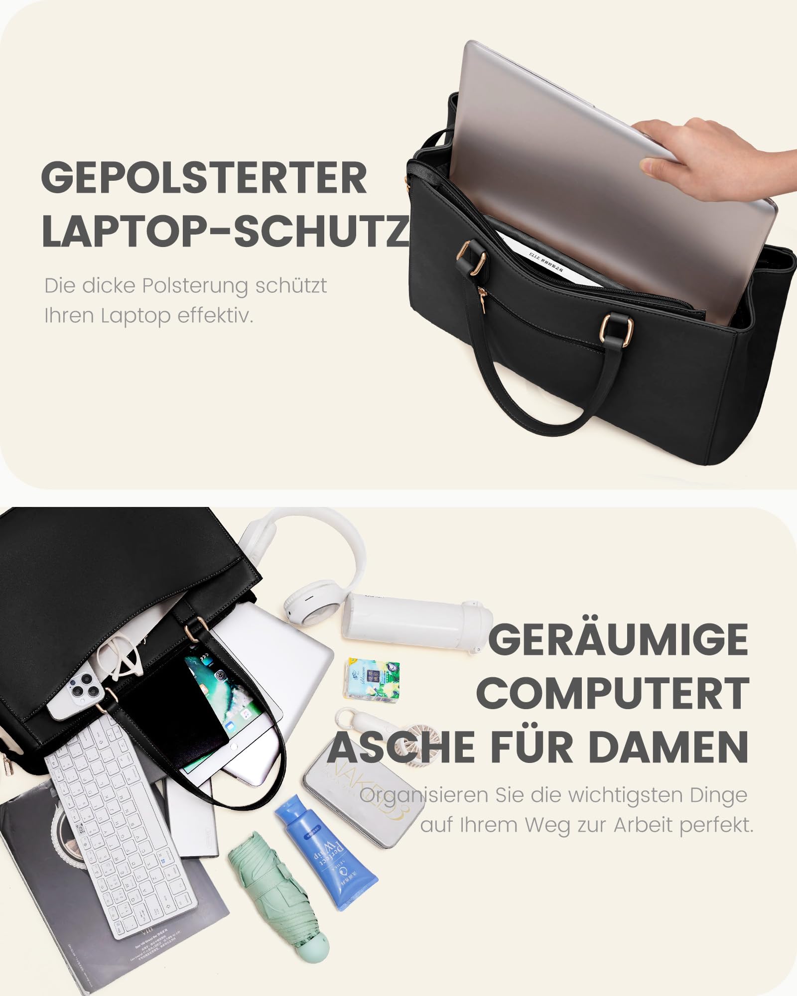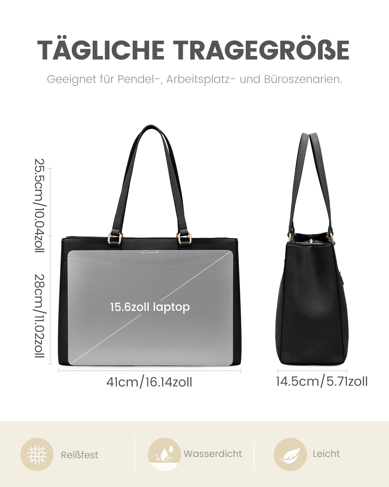 ["【MULTIPLE POCKETS AND COMPARTMENTS】: With dimensions of 16x11x5.7 inches (41x28x14.5cm), this handbag offers ample storage space. The multiple designed compartments allow you to effortlessly organize and keep your items neat. It can hold a laptop, A4 folders, books, and other accessories.","【VERSATILE USAGE】: This shopper bag stands out with its modern, professional design and is easily combined with various outfits. Ideal for work, business, meetings, school, university, and everyday use. The perfect combination of functionality and style.","【SOFT & DURABLE】: This work bag is made of high-quality PU leather, which feels soft but is exceptionally durable. It is not only abrasion-resistant and waterproof, but the precise workmanship and sturdy materials ensure a long lifespan.","【SEPARATE LAPTOP COMPARTMENT】: This women's bag has its own padded laptop compartment, specially designed to protect your 15.6-inch laptop. Whether for daily commutes or business trips, your laptop finds a secure place here and is optimally protected from damage.","【EXCELLENT STABILITY】: This bag remains stable even when empty and does not tip over, highlighting its excellent stability. The four metal feet on the bottom prevent the bag from getting dirty. It always stays in perfect shape, no matter where you place it.","【CUSTOMER SERVICE AFTER PURCHASE】: If you have any questions or issues within 2 years, you can contact us anytime! We guarantee a response within 24 hours and offer you the best solution. Your satisfaction is our top priority!"]