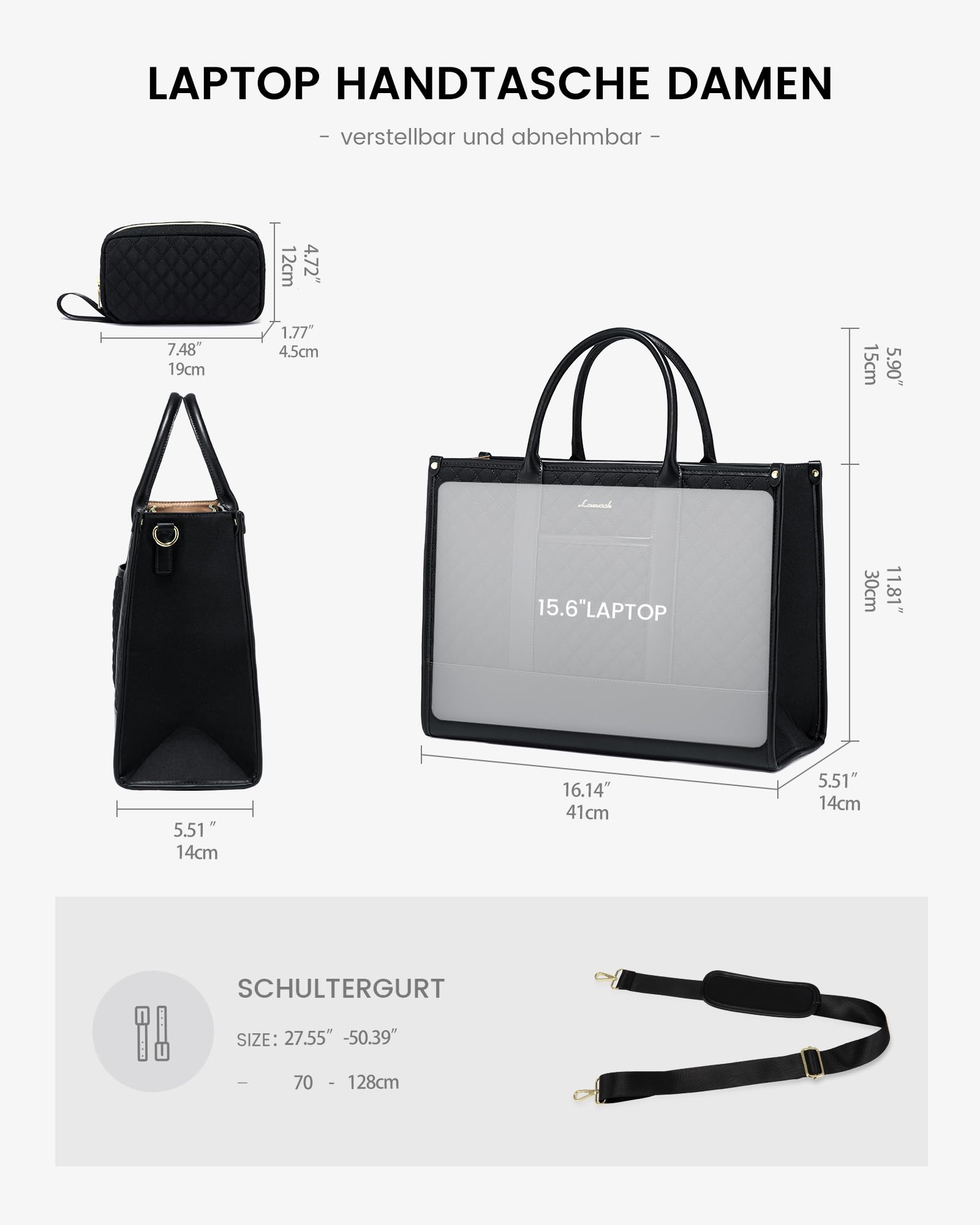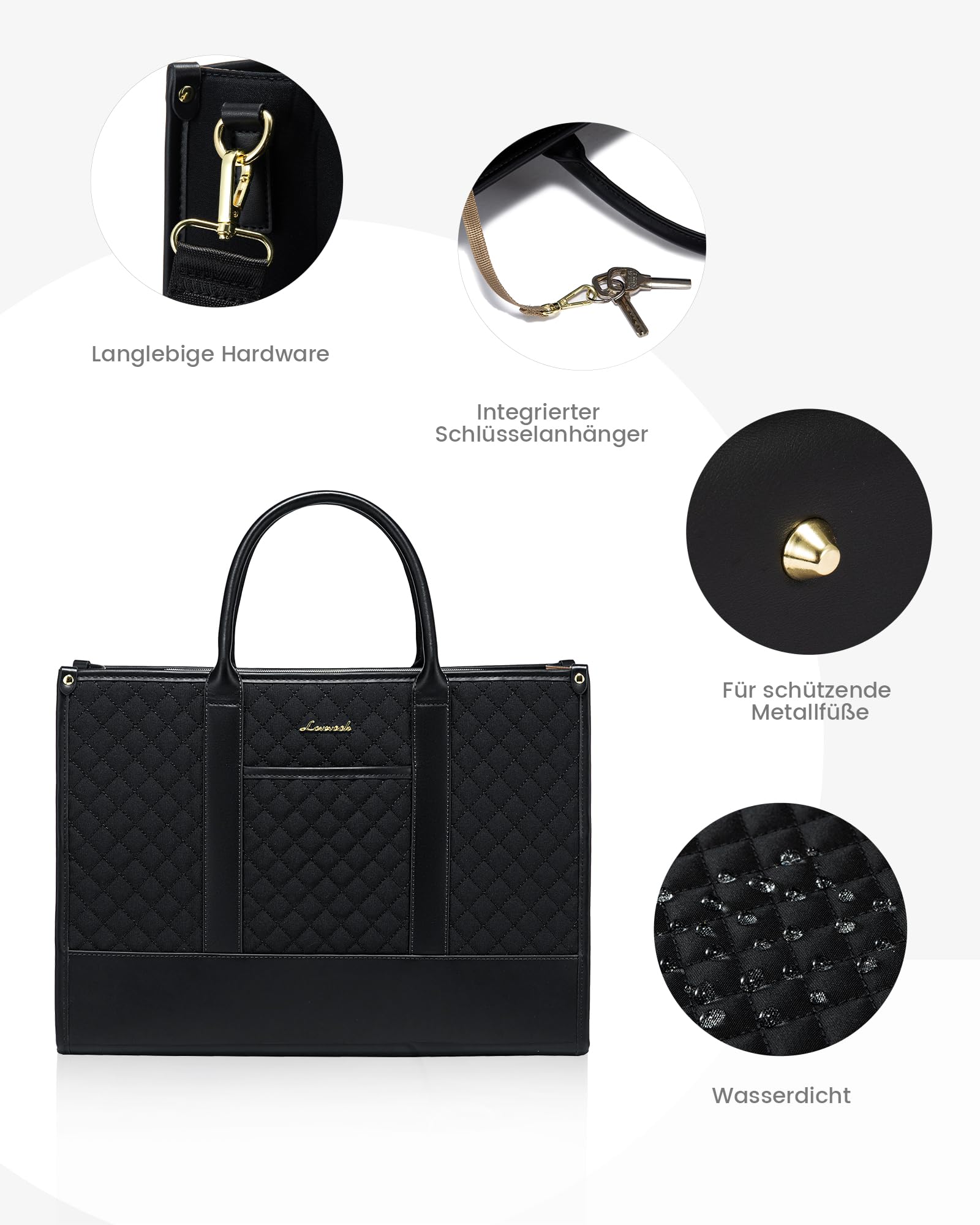["π LARGE CAPACITY+MULTIPLE COMPARTMENTS: This laptop bag has dimensions of 16.14Γ5.51Γ11.81 inches, offering plenty of space and features multiple compartments such as side pockets for bottles, pen holders, zippered pockets, etc. to keep your items well organized. A key hook helps you quickly find your keys.","π» LAPTOP AND IPAD PROTECTIVE COMPARTMENTS: This work bag has 2 professional, thickly padded foam layers - one protects your 15.6-inch laptop, the other your iPad. Ideal for work and university.","β° WITH DATA CABLE STORAGE BAG: This laptop bag comes with a storage bag that includes many mesh pockets. Great for storing power cords, data cables, and other computer accessories as well as study materials.","π½ WITH DETACHABLE, ADJUSTABLE SHOULDER STRAP: This women's handbag is equipped with a detachable and adjustable shoulder strap (27.55~50.39 inches), allowing you to carry it as a handbag, shoulder bag, or crossbody bag as desired. Stylish and practical, ideal for various occasions.","π¦ WATER-RESISTANT AND DURABLE MATERIAL: This tote bag uses high-quality polyester and PU leather, which is not only water-resistant like a little umbrella βοΈ, but also withstands wind and weather to look new for a long time.","π GREAT GIFT: This bag is not only a laptop bag but also a fashionable handbag, making it a perfect gift for women, moms, daughters, etc."]