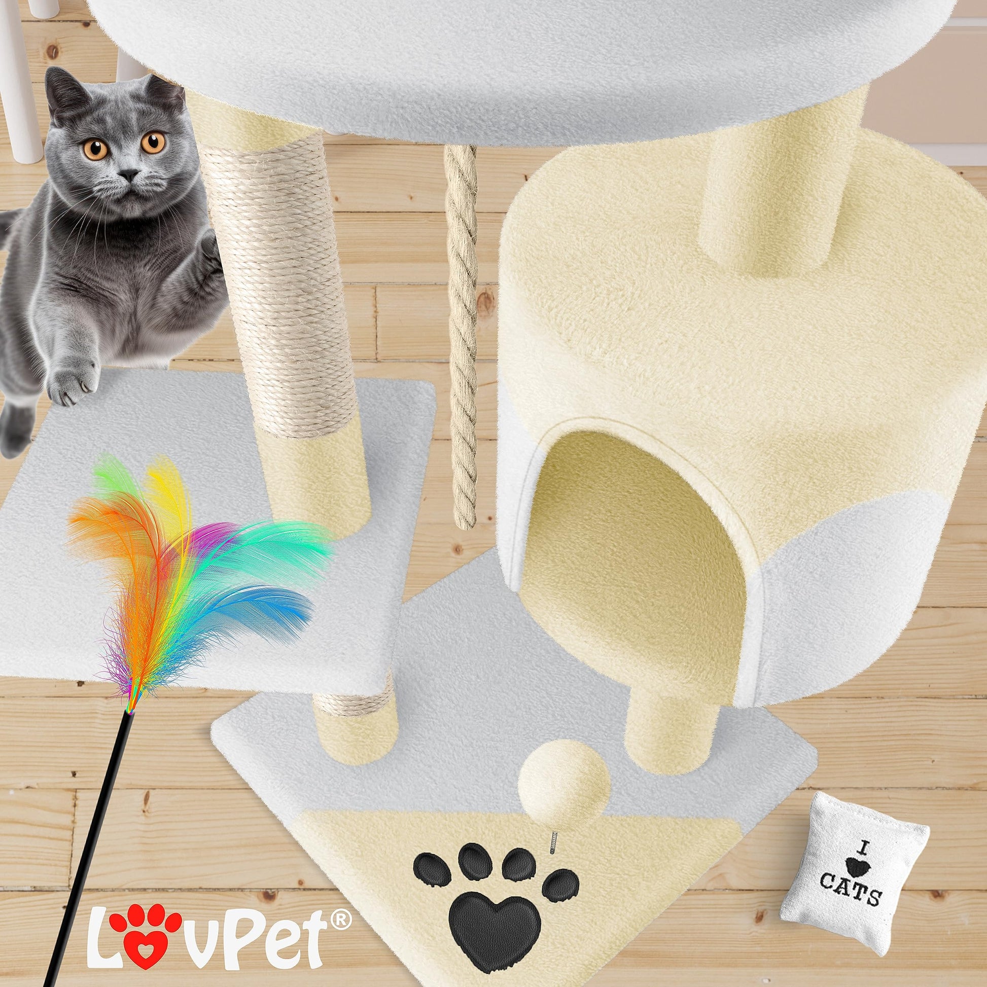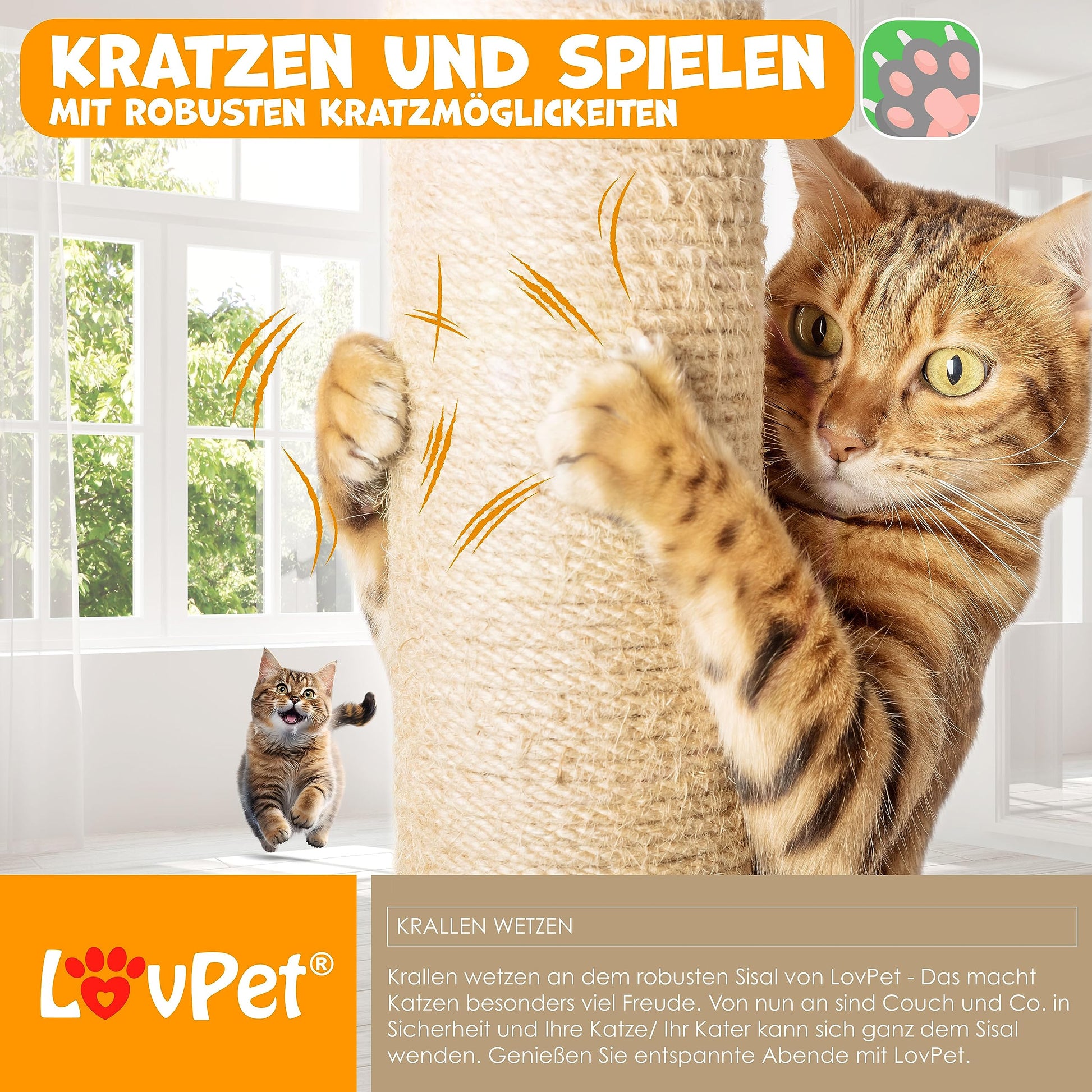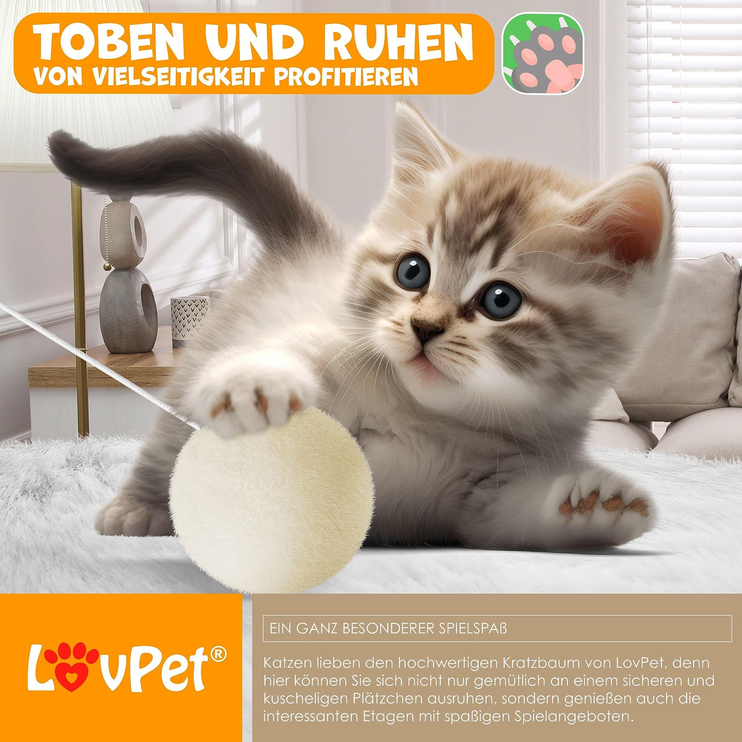 ["LUXURIOUS COMFORT AND ENTERTAINMENT: The LOVPET Cat Tree provides your cat with royal comfort and lasting entertainment, perfect for playful hours and cozy nap times.","AMPLE PLAYSPACE AND RETREAT: Spoil your cat with a generous play area for frolicking and a cozy resting spot for relaxation - the ideal retreat for comfort.","ROBUST SCRATCHING SURFACES: Our scratch-resistant sisal surfaces of the cat climbing tree promote healthy claw sharpening while protecting your furniture. A must-have for happy cats and clean decor.","FUN WITH PLUSH POMPOMS: The fluffy plush pompoms bring extra joy and playful hours. Your cat will love interacting with the cat tower and staying active.","INVEST IN A CAT'S WELLBEING: The LOVPET Cat Scratching Furniture for Cats is more than just a piece of furniture - it's an experience that elevates your cat's life to a new level. Give your cat luxury and joy."]
