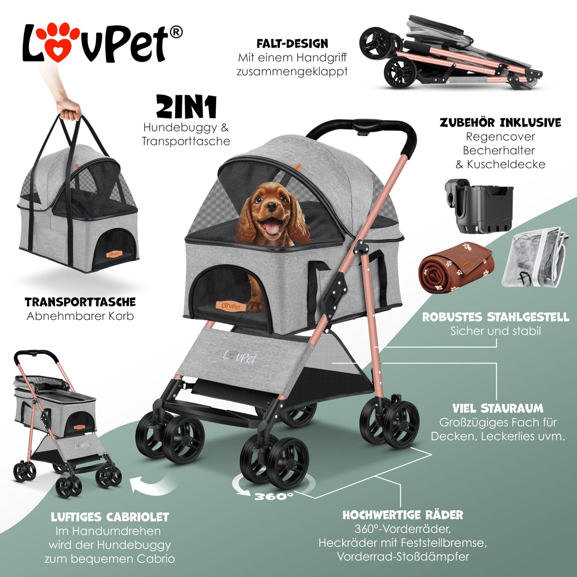 ["VERSATILE HANDLING: The LOVPET brand pet stroller quickly and easily transforms into a dog transport box without a frame, allowing you to easily transport it by hand or in your car! This way, your dog is not limited during any visit or hiking day and can easily accompany you on every trip. The dog buggy increases the range of motion and provides weaker dogs with a very good view. The included cuddle blanket ensures comfort and security on the go."],