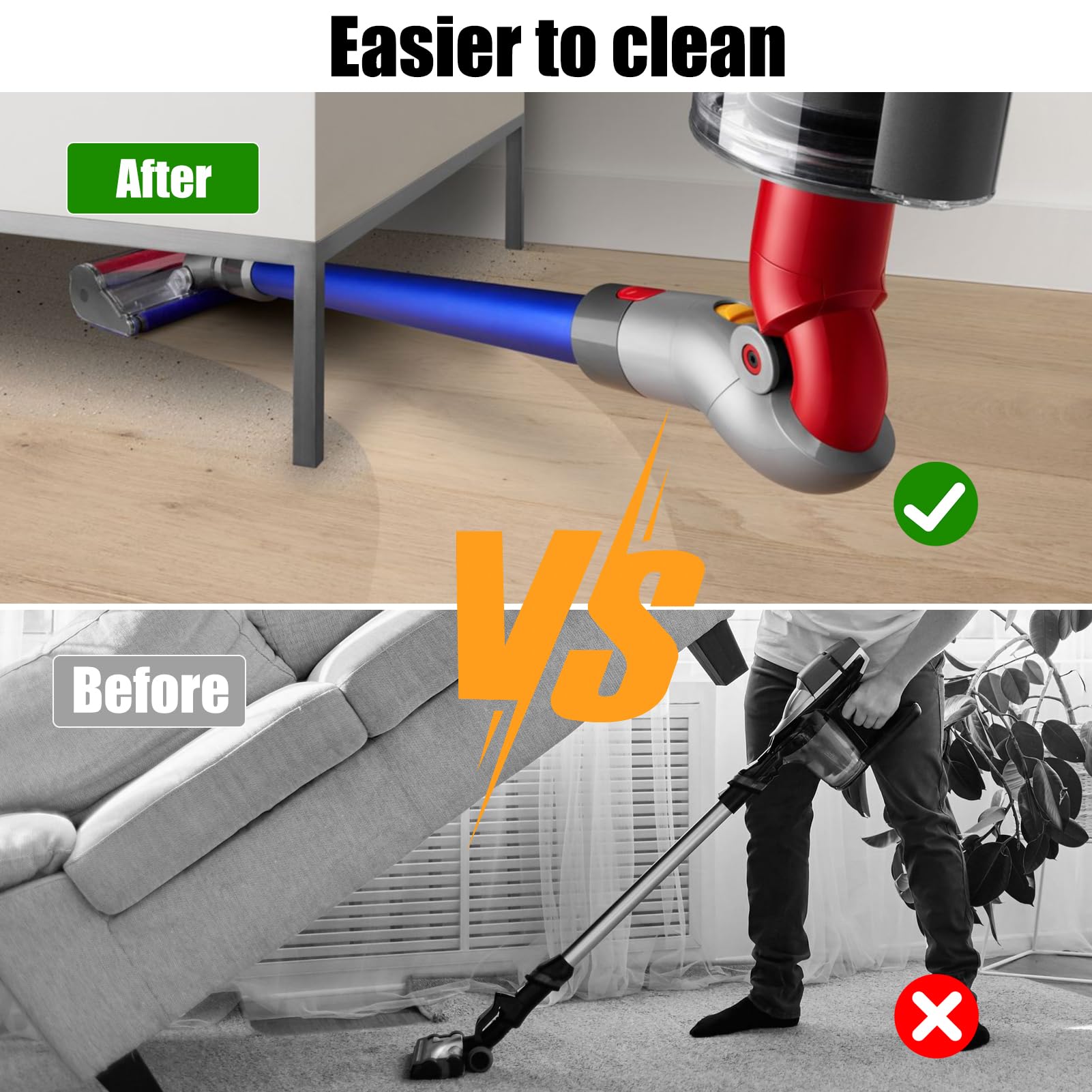 "A click-bend goes deep into the bottom of sofas, beds, and other furniture to make cleaning easier. The depth can reach 1 meter and the height as low as 7 cm, without bending over, making cleaning easier.",