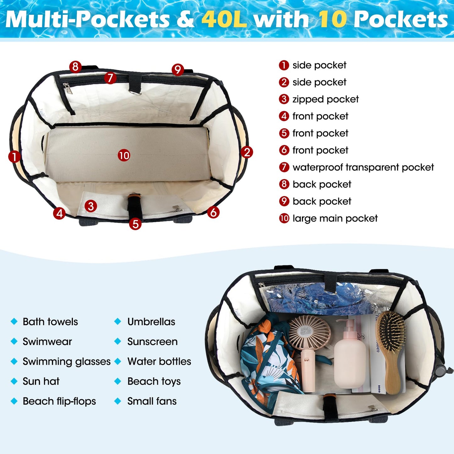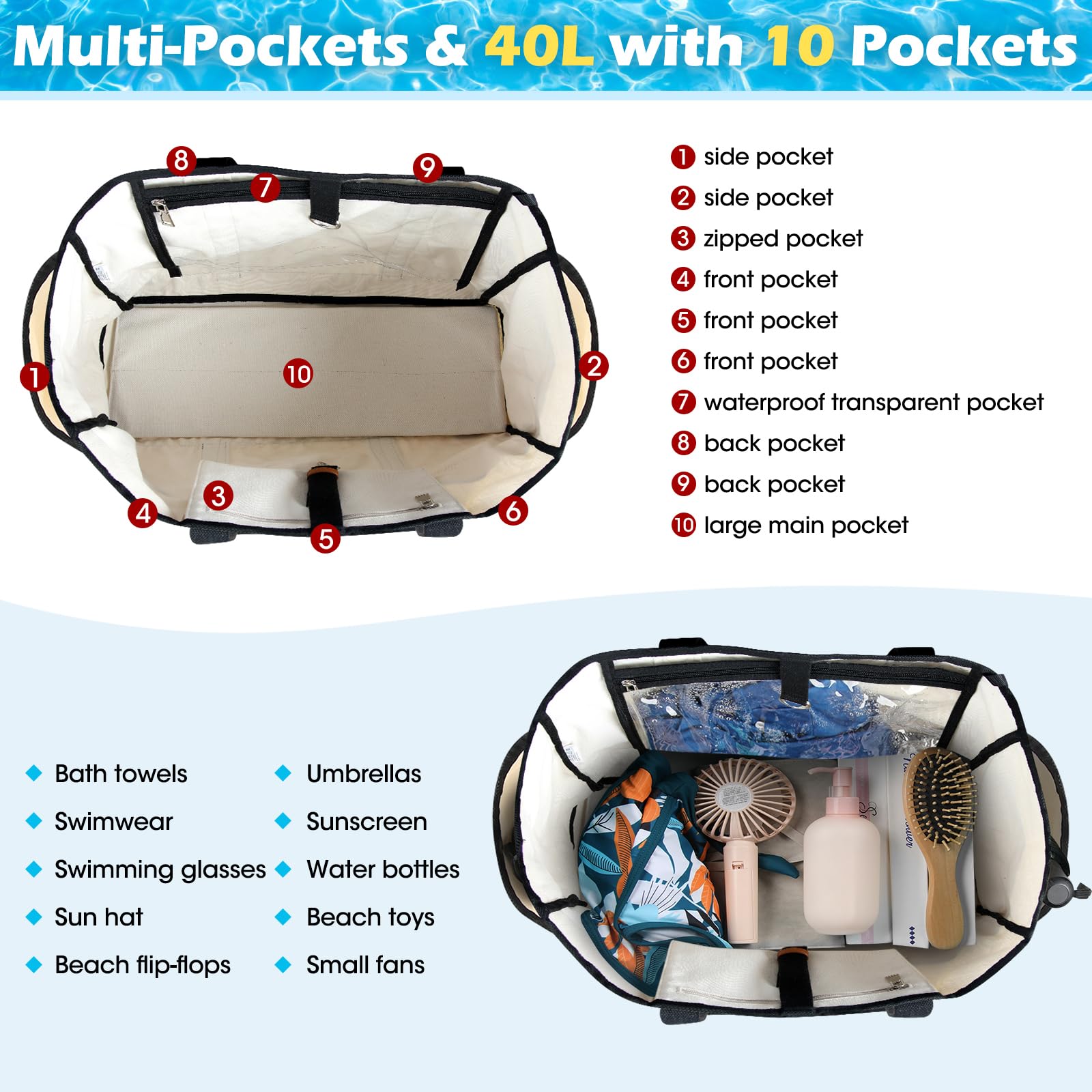 ["Construction of the Large Beach Bag"] 30L beach bag for women has 4 outer pockets, 1 large compartment, 1 interior zip pocket, and 1 waterproof pocket, totaling 7 pockets; a sun hat can be hung on the back of the 30L beach bag. 40L beach bag has 7 outer pockets, 1 large compartment, 1 interior zip pocket, and 1 waterproof pocket, totaling 10 pockets; the back of the 40L beach bag for women can be attached to luggage for easy transportation.