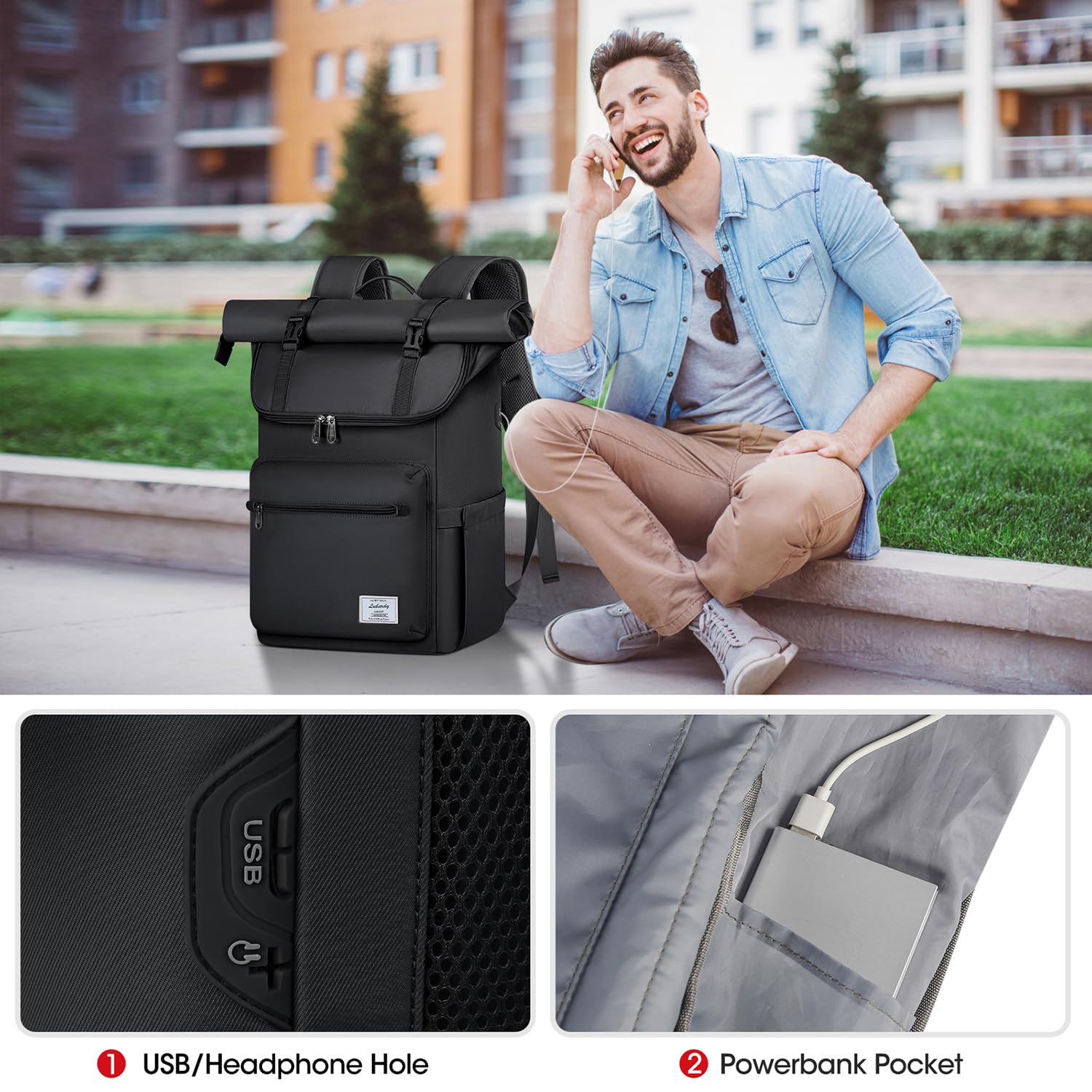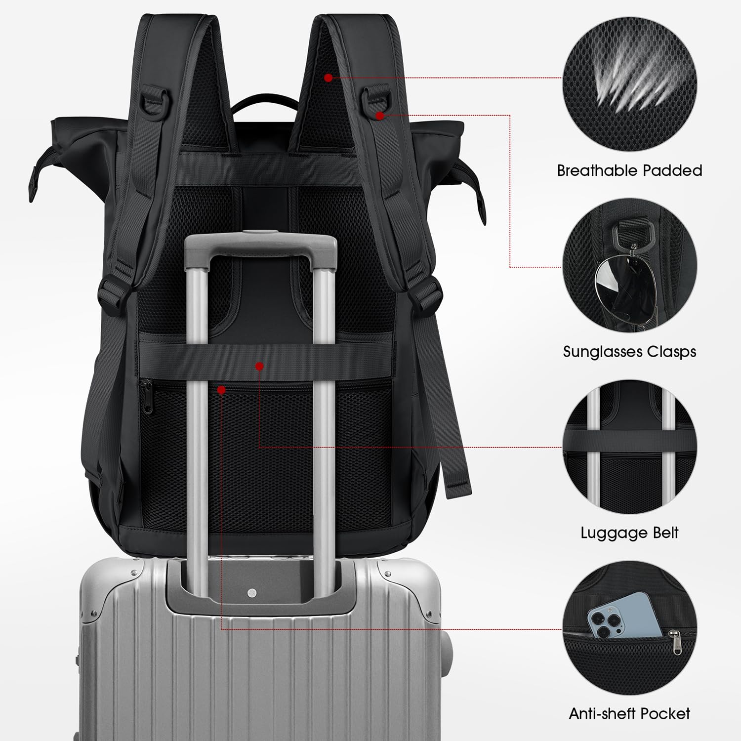 ["Large main compartment: This rolltop backpack for men features a separate internal padded laptop compartment with thick padding for 13-17.3 inch laptops and a large slip pocket for storing iPads, magazines, etc. There is also 1 wall pocket with zipper, 2 slip pockets, 2 pen pockets, and a keyring to provide space for small items such as keys, wallets, headphones, tissues, and pens, as well as an internal compartment for a portable charger.","Unique external design: The backpack has an external zippered pocket on the front for storing chargers, cables, keys, etc. And two side pockets with elastic bands for water bottles and umbrellas. The back is designed with a separate anti-theft pocket to store your phone and other valuables. The luggage strap is designed to securely attach the backpack to your suitcase.","Waterproof material: This backpack for men is made of high-density polyester, which is waterproof, scratch-resistant, and tear-resistant. With padded shoulder straps, it is very breathable and comfortable and can be used for various occasions such as studying, working, hiking, camping, and picnicking.","USB/Headphone port: This rolltop backpack for women has a USB and headphone port, making it fully functional when your phone or headphones run out of power. You can put the power bank inside the backpack, and you can walk and use your phone or headphones at the same time. The hooks on the shoulder straps are perfect for storing your sunglasses.","Expandable capacity: Rolled size: 32 x 15.5 x 51 cm. Expandable size: 32 x 15.5 x 70 cm. The backpack has smooth double zippers on the front and top, making it easy for you to organize your things. Capacity: 23L-32L, can accommodate your various necessities such as clothing, shoes, magazines, computers, phones, etc., ideal for travel."]