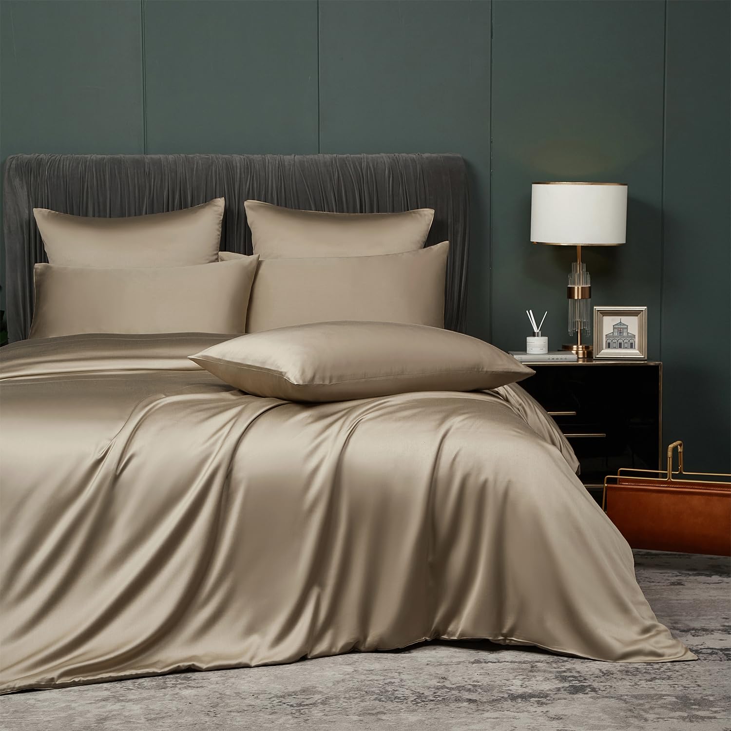 Luofanfei Bamboo Bedding 220x240 cm Gold Khaki Summer Cooling Solid Bamboo Lyocell Shiny Bedding Set Breathable Bamboo Luxury Duvet Cover and Pillowcases 80x80 cm with Zipper