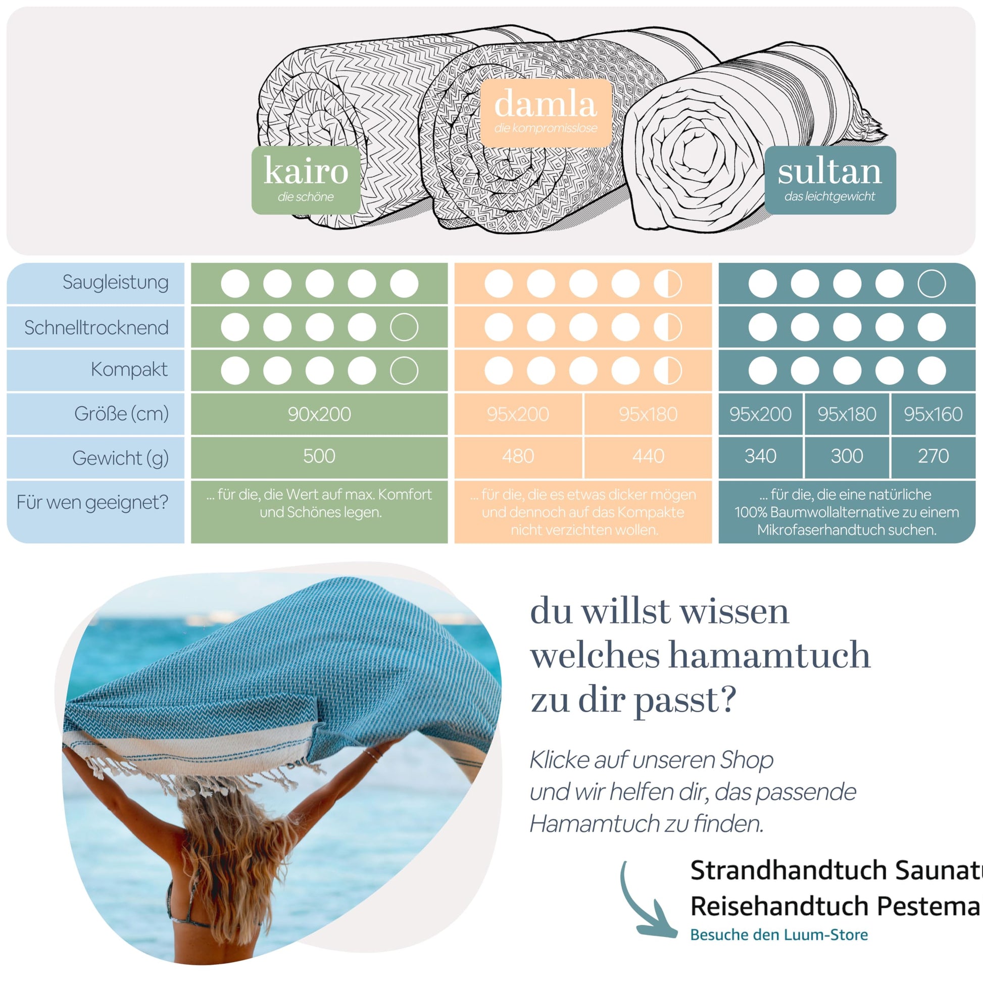 ["I AM BETTER THAN A MICROFIBER TOWEL!"] - I am light, absorbent, and quick-drying like a microfiber towel, but without the unpleasant feeling of plastic on your skin. Choose natural fibers over chemical fibers from oil. With my compact size of 26x10cm, I offer you comfort from 1001 nights to take with you. I can't fly yet, but maybe I'll learn that too. ["TERRY CLOTH? I DON'T TAKE IT SERIOUSLY!"] - With 500g at a substantial 90x200cm, I surpass any terry cloth. Even though I weigh less than half and am flat woven, my special weaving method offers you the same comfort. Going to the pool with the family? Traveling in a motorhome? Camping? Need several sauna towels to have a dry one on hand? No problem with me - promised! ["SAND-FREE, HUGE, COOL"] - As a beach towel, I've got a lot to offer. I keep the sand off you. I make a great impression on a beach lounger with my length. I also enjoy being used as a gym towel after a workout. After your shower, I dry you off easily and am dry myself before you get dressed. Your sports bag will appreciate me, a wet/heavy terry cloth is a thing of the past. ["A VERSATILE GIFT TO GIVE"] - I take multifunctionality to a new level. Try me as a pareo, light beach dress, thin camping towel, compact picnic blanket, quick-drying bath towel, comfortable beach blanket, or simply as a Hamam sauna kilt - your imagination knows no bounds. Gift me individually or in a double pack to your loved ones and joy is guaranteed. ["MY PROMISE"] - My inventors put a lot of effort into me. When they realized that many Hammam towels contain polyester but are still sold as 100% cotton and microfiber towels are no longer up to date, they wanted to create something special. That's where I come in, and I'm here to stay. Hello, my name is Luum and I am 100% cotton.
