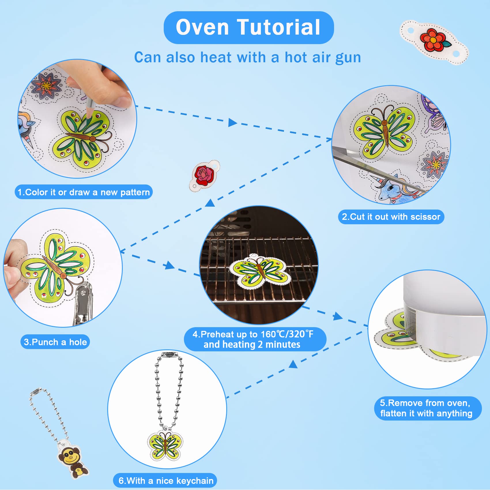 👉With the Shrink Film, Kids Can Create Objects with 3D Effect: Jewelry, buttons, keychains, gift tags, pendant magnet pins, buttons. Do not touch the shrunk piece directly after baking. With this shrink film keychain set, you can make keychains, earrings, brooches, gift tags, bookmarks, jewelry pendants, and more.