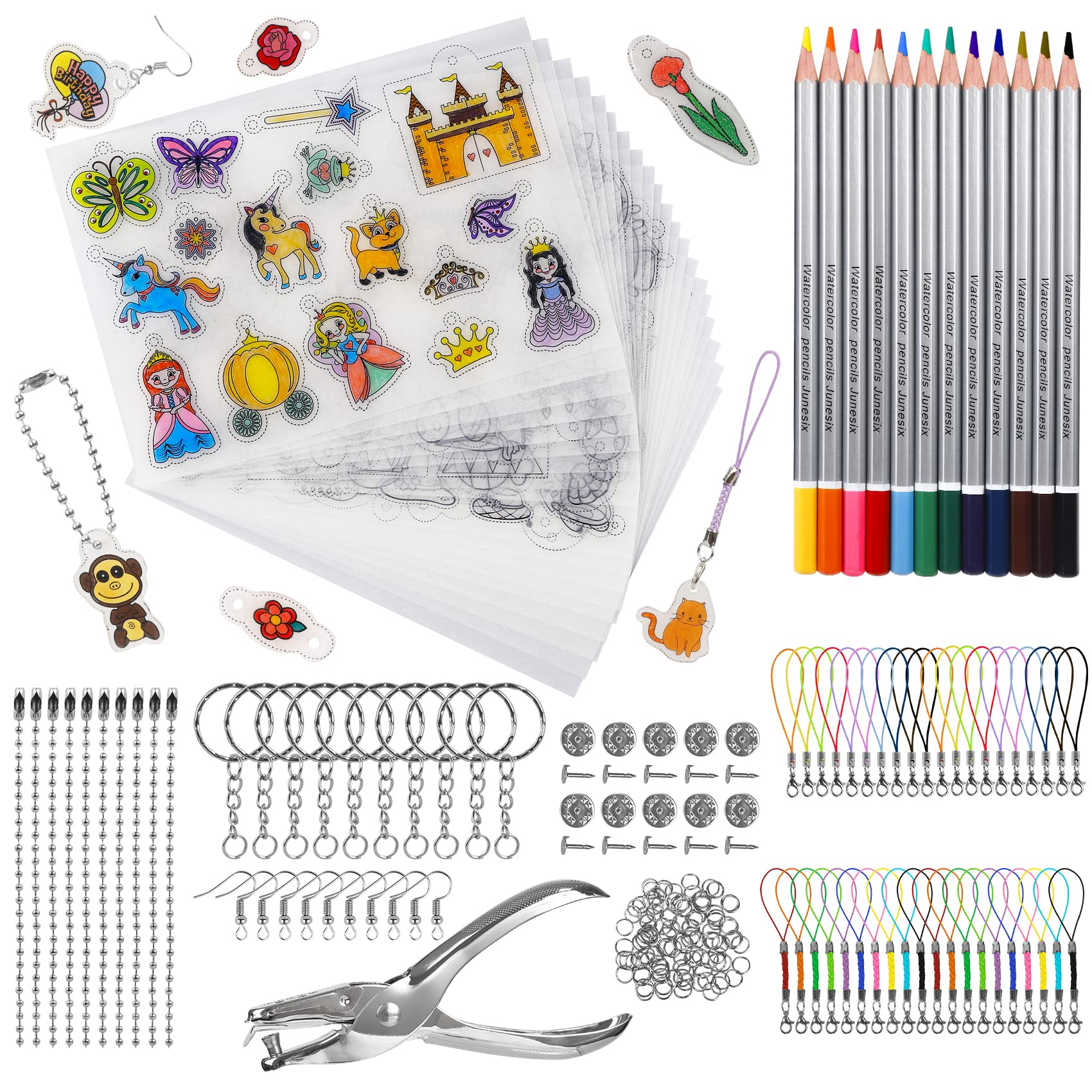 👉213 Piece DIY Shrink Film Set: 8 A4 shrink films with motifs, 12 A4 shrink films without motif templates, 12 colored pencils, 180 keychains, 1 manual, 1 hole punch. Perfect crafting set for beginners and advanced.