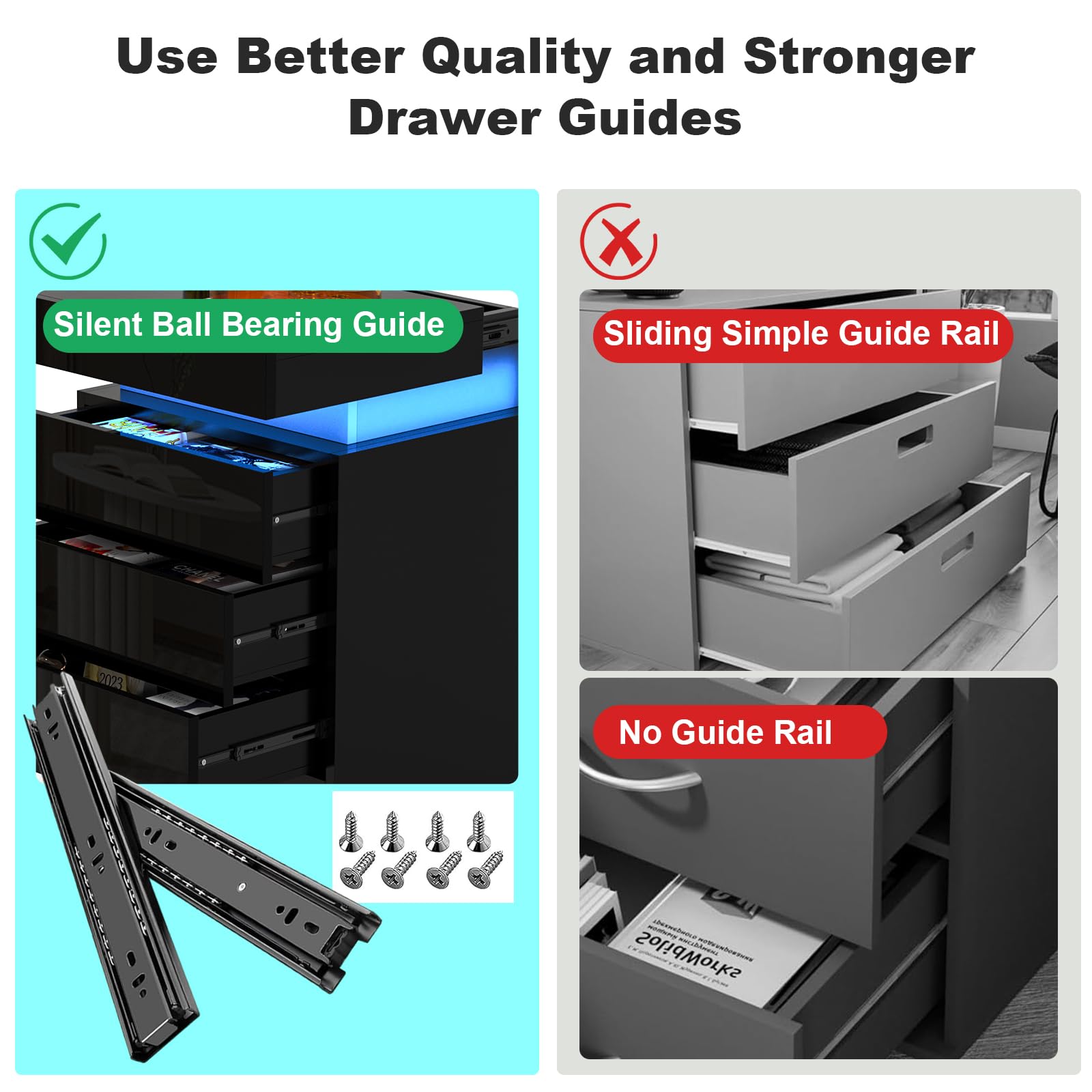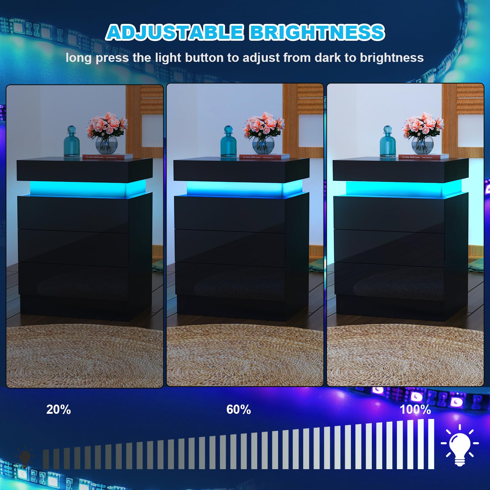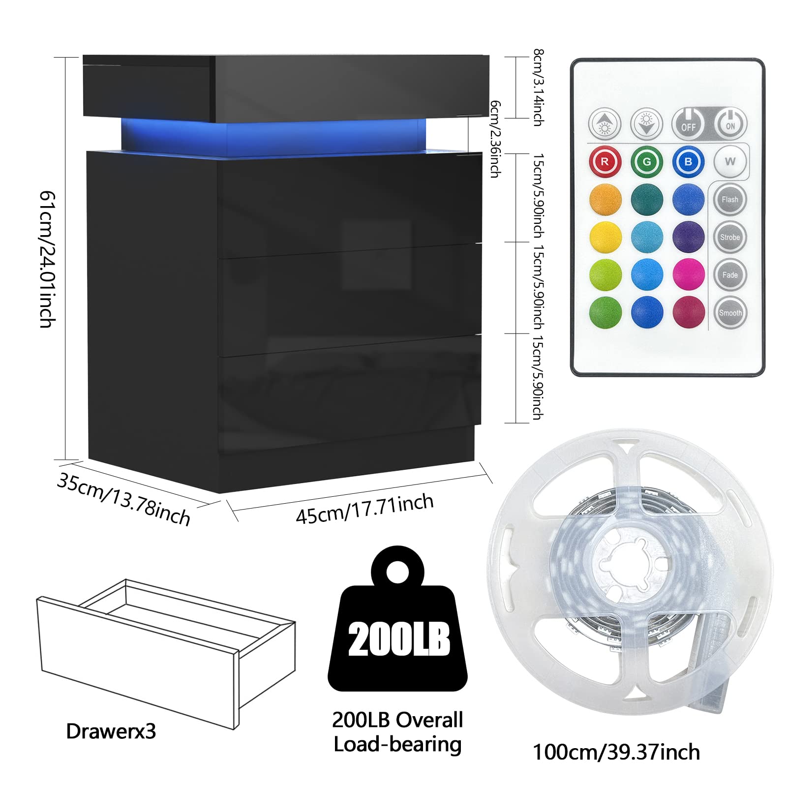 "【16 Colors Adjustable】- Nightstand comes with beautiful multi-color RGB LED lights. 16 color changing, 16 speed adjustment, 4 brightness modes to choose from. For practical reasons, this bedside table supports an infrared remote control to control LED lights.