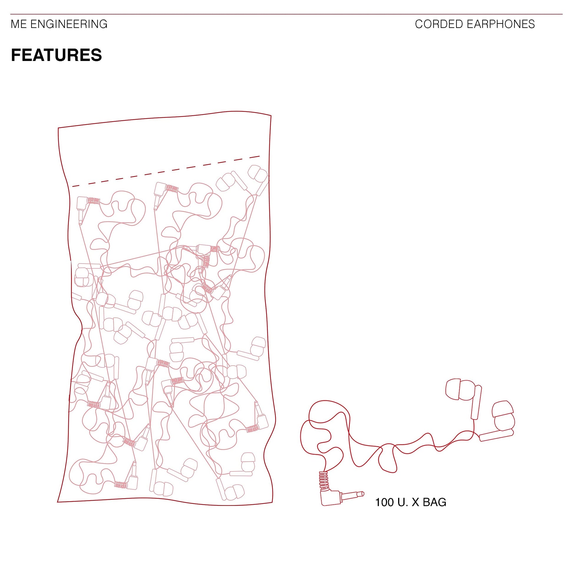 ["100 headphones with 3.5mm jack, ideal for wholesale, museums, transportation, shows.", "Packed in a single plastic bag for convenience and hygiene.", "Disposable headphones in red.", "Highest sound quality with official CE and ROSH certifications."]