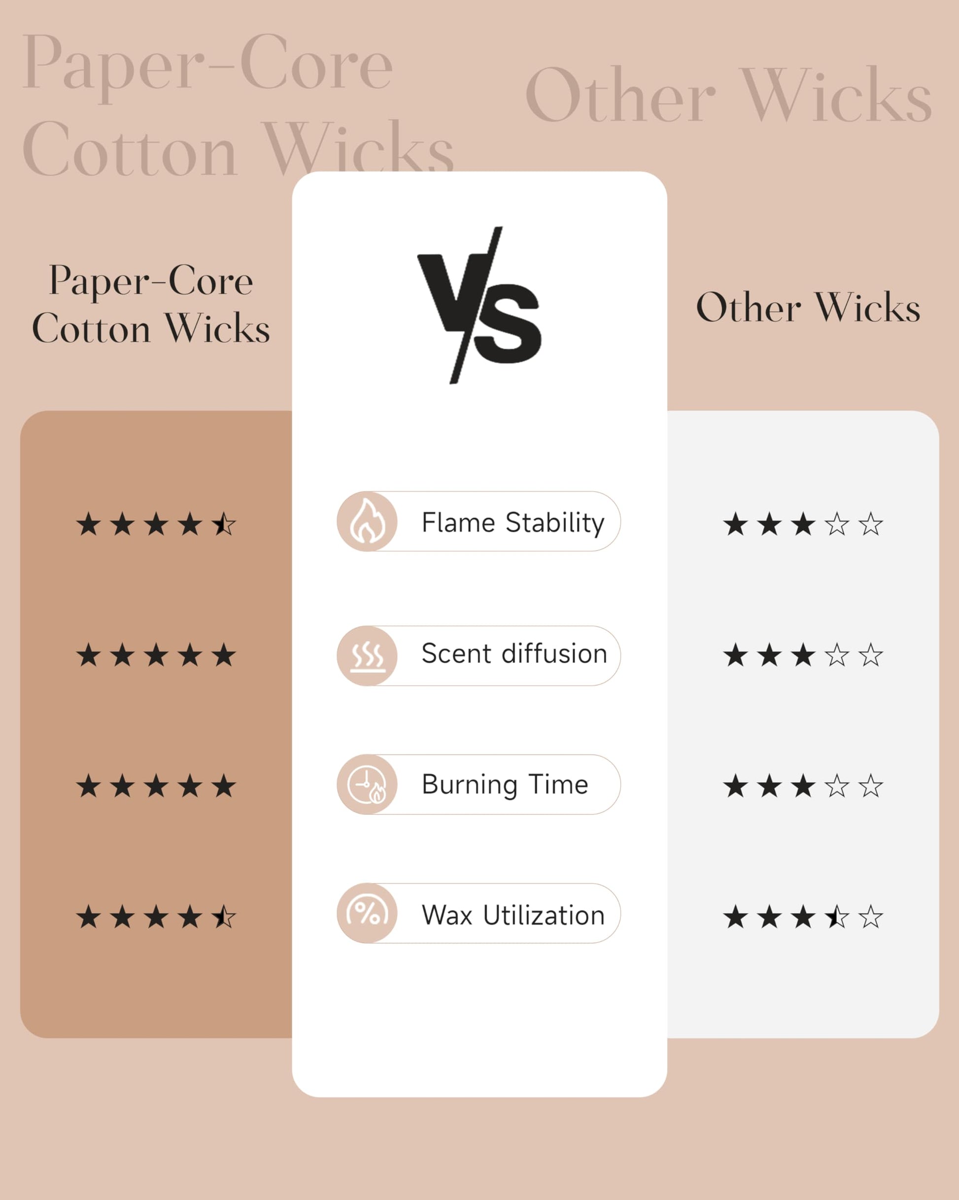 Clean and even burn - With 2 lead-free cotton wicks for a consistent burning result. These are flat cotton wicks with continuous paper that offer higher rigidity and a more even burn than 108% cotton wicks. Designed to reduce carbon deposits that lead to black soot.