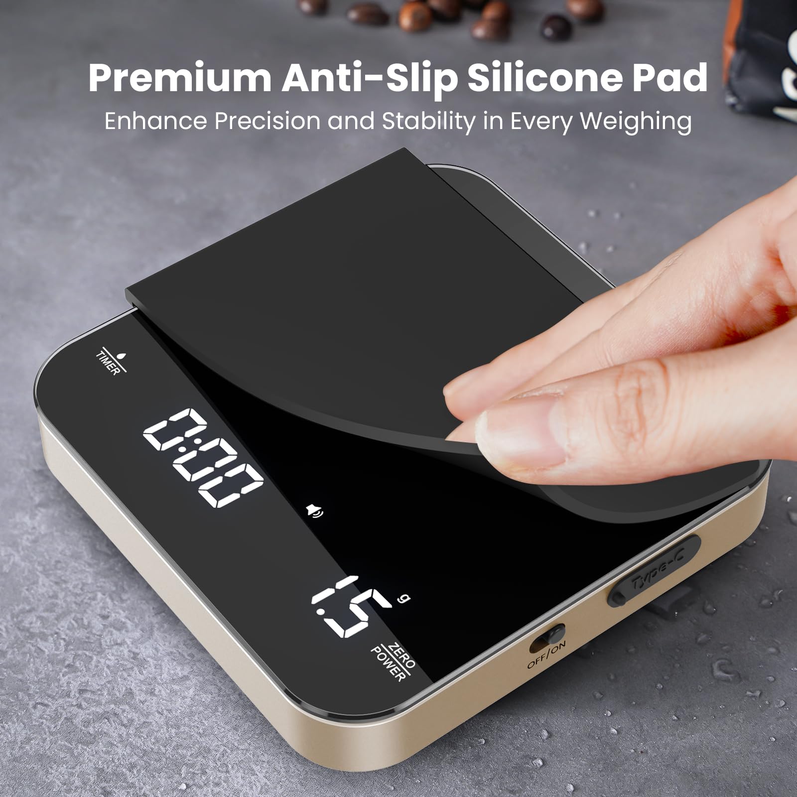 ["Ultra small, but professional】The espresso scale is small enough to fit in the palm of your hand. It measures 4.13*4.13*0.78 inches and weighs only 0.75 pounds. The coffee scale can be used with most espresso machines and small pour-over coffee stands. It is easy to store and transport, making it perfect for coffee lovers who enjoy drinking coffee outdoors.","【0.1g High Precision】This digital kitchen coffee scale is equipped with high-precision sensors and a reliable microprocessor that guarantees precise measurements every time. With an accuracy of 0.1g and a measuring range of 0.5g-2000g, it is particularly suitable for espresso and pour-over brewing methods, ensuring flawless results.","【Three Units & Two Timing Modes】The digital espresso timer scale has three units of measurement (g/oz/ml) that can be converted at any time. The small coffee scale has two built-in timing modes, automatic and manual, allowing you to precisely determine the brewing time of the coffee. This feature ensures that your coffee is always brewed deliciously and perfectly to your taste.","【Rechargeable Battery with Long Standby Time】The gram scale has a built-in 500mAh lithium battery and a USB-C charging cable in the package. There is no need to replace or buy batteries, they can be used for up to 90 days on a single charge. The coffee scale automatically switches to sleep mode after 5 minutes of inactivity to save power.","【Elegant Design and High-Quality Materials】The Maestri House Digital Coffee Scale features a sleek, minimalist design with a borosilicate glass surface. It elegantly blends into your kitchen and complements your decor perfectly. With a hidden LED display and touch-sensitive controls, its seamless surface enhances aesthetics and ensures waterproofing and easy cleaning. It includes a detachable silicone pad to protect the surface, providing waterproof, non-slip, scratch-resistant, and heat-insulating properties.","【Silent Brewing】Experience a quiet coffee morning with the mute function of our coffee scale. Press and hold the TIMER and ZERO buttons for about 2 seconds to deactivate the beep and enjoy a peaceful start to your day."]
