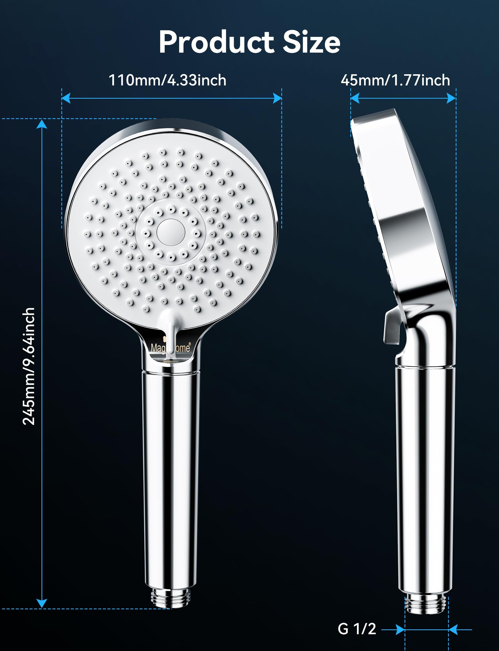 ["Improved 20-layer filter system: The Magichome shower head filter features a powerful 20-layer filter system. The filter is made of high-quality KDF, calcium sulfate, vitamin C, and mineral balls that can effectively remove chlorine residues, heavy metals, and other impurities and pollutants.","5 spray modes: Shower head with filter has 5 spray patterns, allowing you to easily switch between different modes. Ideal for daily hair washing, gentle showers, massaging, bathing children or pets, bathroom cleaning, and more.","High-pressure shower head: This powerful shower head uses air pressure technology to increase water pressure. With dense and powerful water flow, it provides you with a rejuvenating experience with full coverage. Say goodbye to all the problems of traditional shower heads and enjoy a healthy rain shower.","Anti-blocking filter shower head: Compared to other ordinary filter shower heads, the latest Magichome filter shower head is equipped with an anti-clog silicone nozzle that prevents limescale buildup and is easy to clean. It will give you a better user experience.","Improved shower head by Magichome: As the first brand to develop shower heads with filters, this shower head combines a filter with a large silicone nozzle and is our latest product. Magichome holds an exclusive patent for this shower head. If you live in an area with hard water and need to replace your shower head, the new improved shower head by Magichome is the better choice"]