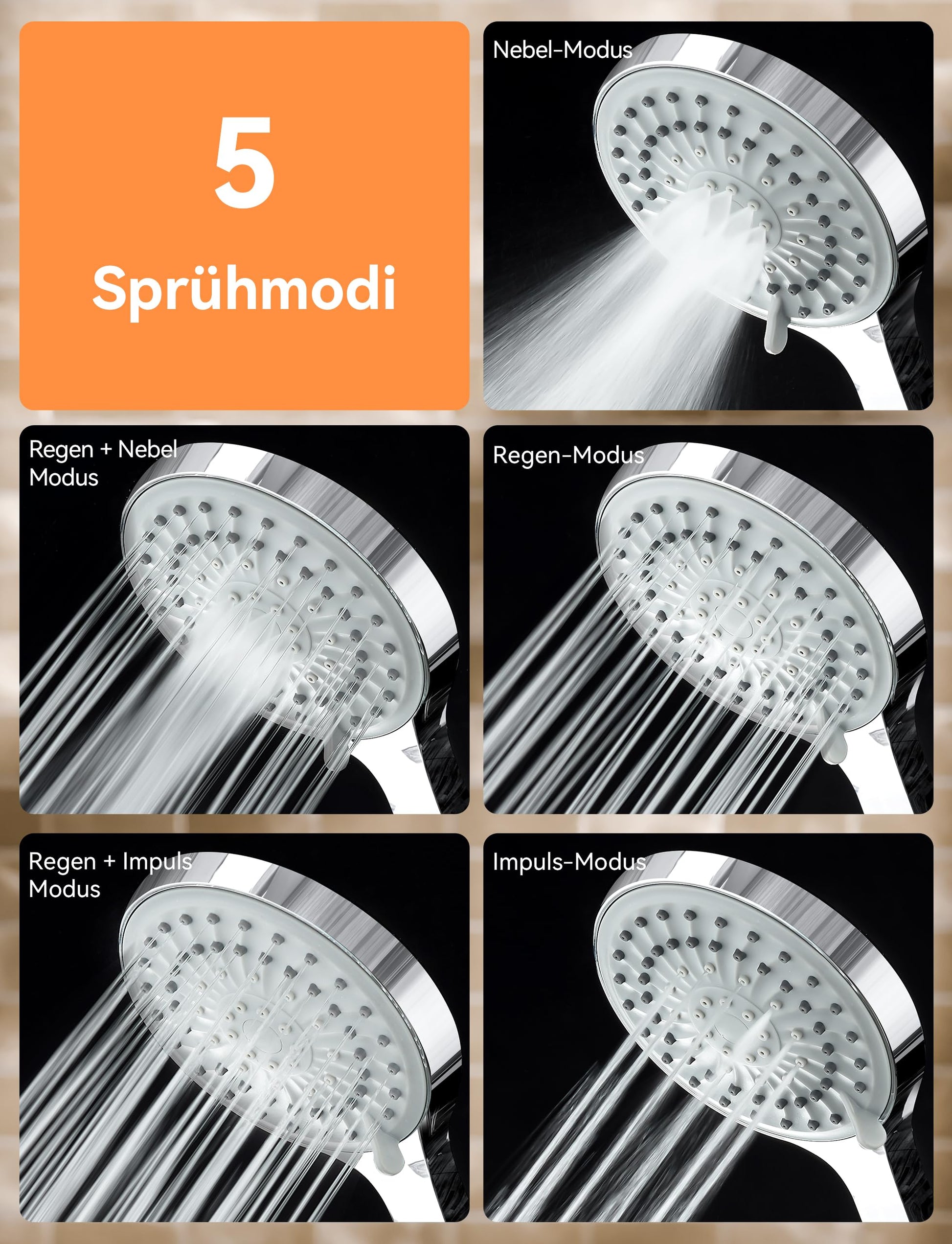 ["High Pressure Shower Head: Magichome shower head adopts micro porous pressure technology that can effectively enhance your water pressure, saving up to 30% water. This high pressure shower head is suitable for low water pressure areas.","Shower Head with 5 Modes: This shower head features 5 different spray modes to meet your various showering needs. Each mode offers a different shower experience that can meet your family's needs.","Multi-Layer Thickened ABS Material: This handheld shower head is made of high-quality ABS material and multi-layer chrome plating, making the shower head more corrosion-resistant and lightfast.","Stainless Steel Hose: The Magichome shower hose is made of stainless steel with a chrome surface. It is stretchable, sturdy, and break-resistant. Hose with G1/2 (20 mm) connection, suitable for most standard shower heads.","Easy to Install and Clean: No tools are required for installation. The shower head has a G1/2 connection, suitable for most shower faucets. The shower head with anti-silicone nozzles has good elasticity and abrasion resistance, making it easy to clean residue by simply scraping it off with your finger."]