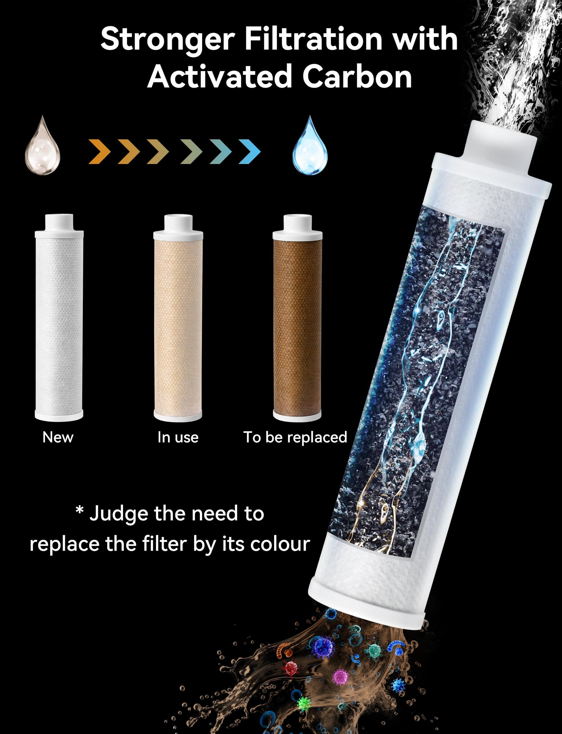 ["Dual Filter System, Deep Water Cleaning Magichome Showerhead uses activated carbon filter and high-precision cotton filter. Activated carbon diameter is 1-4 nanometers, adsorption capacity far exceeds other activated carbon of the same volume. The cotton filter effectively filters out small impurities, suspended solids, etc. from the water","High Pressure, Dense Water Flow There are 240 0.35mm water outlets distributed on the panel. This allows the water pressure to be gently increased even with low water pressure. Dense water is almost foggy with appropriate water pressure, allowing water to quickly penetrate the hair and body, experiencing watery and radiant skin","3 Mode Showerhead 3 switch modes for Cleaning, Pause, and Normal are added to the handle to meet your different needs","304 Stainless Steel Showerhead Panel The plate is made of 304 stainless steel material with higher hardness and stronger corrosion resistance, water outlets are less likely to clog","99% Antibacterial Showerhead from the inside to the outside, to connect the inorganic silver antibacterial active ingredients system, effectively resist common germs, antibacterial rate can be up to 99%, to ensure that purer and healthier water for the skin is produced"]
