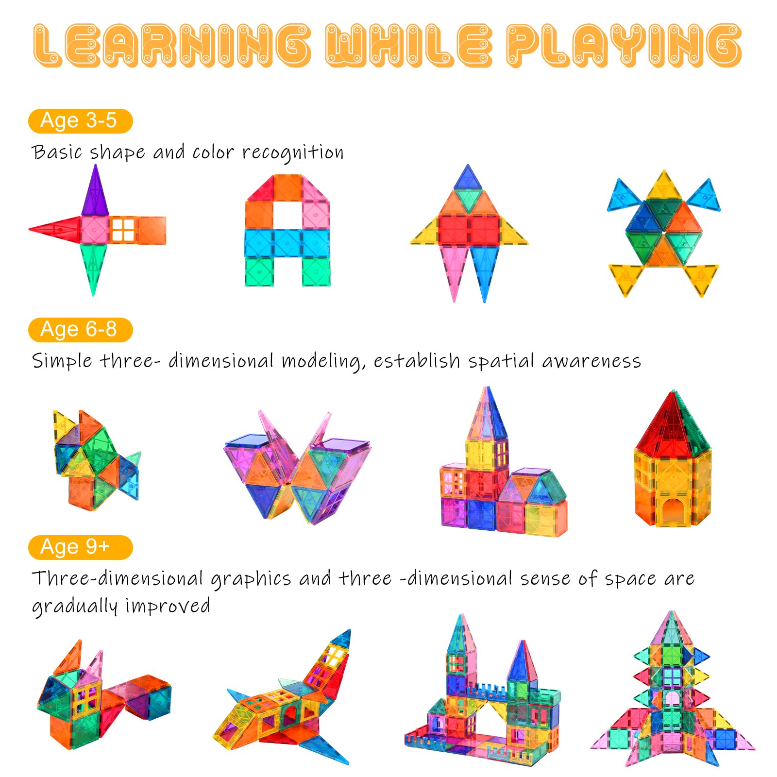 ["100 PCS Strong Magnetic Building Blocks: These 100 PCS magnetic building blocks come with different shapes for DIY models, compatible with other brands of magnetic blocks of the same size. Stronger magnetism makes it easier and faster to build stronger buildings that won't easily collapse.","STEM Kids Toy: Learning toy made of ABS plastic and magnet material. The smooth surface and rounded edges are designed to not scratch or hurt children's hands. Magnets for kids are easy to build and store.","Creativity & Brain Development: Attractive, highly transparent rainbow magnetic toy that promotes children's brain development. Learn to match a variety of geometric shapes and help them develop color and shape awareness. You can create a variety of flat 2D shapes or geometric 3D shapes.","Hands-on and Social Skills UP: Easy to build, the magnetic building blocks for kids are rich in fun and playfulness. They are great for training children's logical thinking, concentration, practical skills, imagination, brain, and cooperation, making them the perfect preschool toy. They are suitable for interactive play between parents and children and are ideal for kindergartens, daycare centers, preschools, etc.","A Gift Kids Will Love: Includes a 100-piece magnetic construction toy set and a creative booklet, compatible with other magnetic building blocks of similar size, recommended for children aged 3 and up. The best Christmas birthday gift toy for kids. If there are any quality issues, please feel free to contact us via email."]