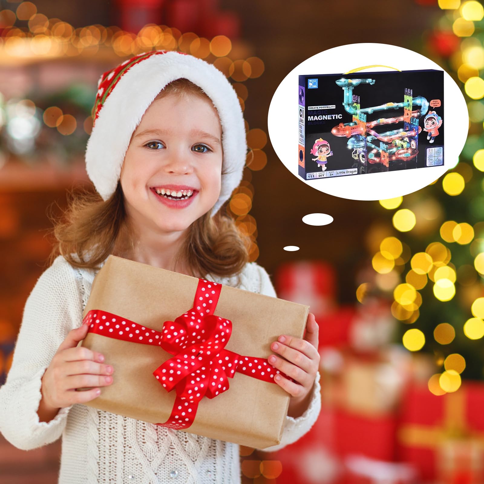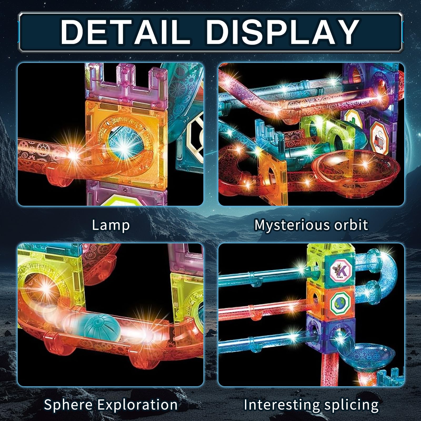 "Glowing Magnetic Building Blocks: Our magnetic toys for children Total 111 pieces. New and improved design, magnetic blocks, marble tubes and colorful balls that roll up and down quickly. Easy to assemble and disassemble. The thin and light design of the magnetic blocks makes it easy for children to grip, disassemble and build","High-quality Material: Made of high-quality material, the smooth surface and rounded edges are designed to not scratch or injure your child's hands. Magnetic toys for children are easy to build and easy to store. These magnetic blocks come in various shapes and colors, providing many opportunities for play and creativity","Educational Toy: The combination of magnetic blocks provides opportunities for creativity. children can build small three-dimensional shapes like houses, sunflowers, snails, elephants, castles and playgrounds. Your child would acquire a strong sense of color, geometric shapes, creativity, color and shape recognition, spatial imagination, patience, and problem-solving skills","Family Game: This set of magnetic children's building blocks allows parents and children to interact effectively and is a high-quality toy that promotes parent-child bonding. It also enhances your child's logical thinking, creative coordination, and other skills. Magnetic children's toys effectively help children acquire spatial imagination, artistry, and problem-solving skills","Magnetic Building Blocks: Glowing magnetic building blocks are durable, easy to store, and versatile. Boys and girls can let their imagination run wild. It can achieve hours of screen-free play, hand-eye coordination, color and shape recognition, creativity, and construction. Logical thinking is developed in the game"