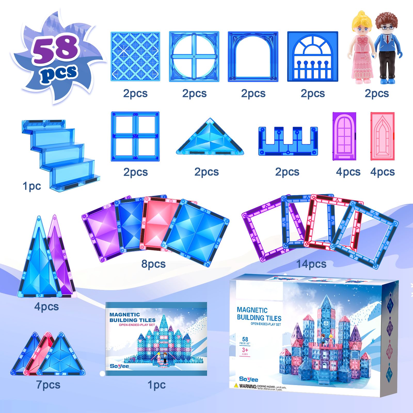 ["VARIOUS SQUARE AND DIAMOND MAGNETIC BOXES - The 58-piece magnetic building toy is made of safe and durable food-grade ABS plastic, complete with doors, windows, and stairs. Our small children's toy set with magnetic building blocks Diamond tiles has carefully selected durable parts so your princess can build her own winter castle and kingdom"]