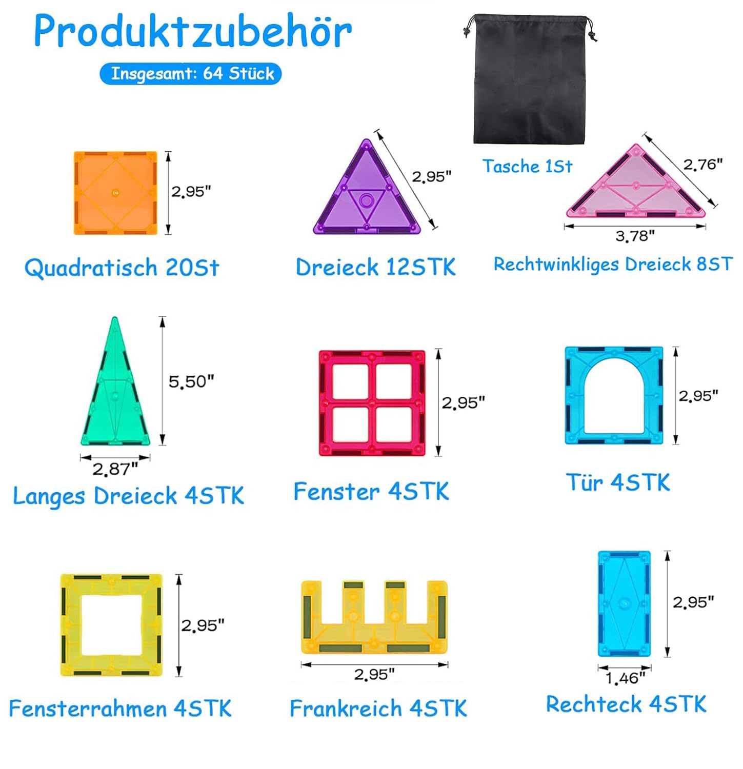 🎈Various shapes: This 64-piece kids magnetic toy set includes 20 squares, 12 small triangles, 8 right triangles, 4 long triangles, 4 door shapes, 4 window frames, 4 rectangles, 4 fences, 4 small rectangles, and 1 storage bag instructions.