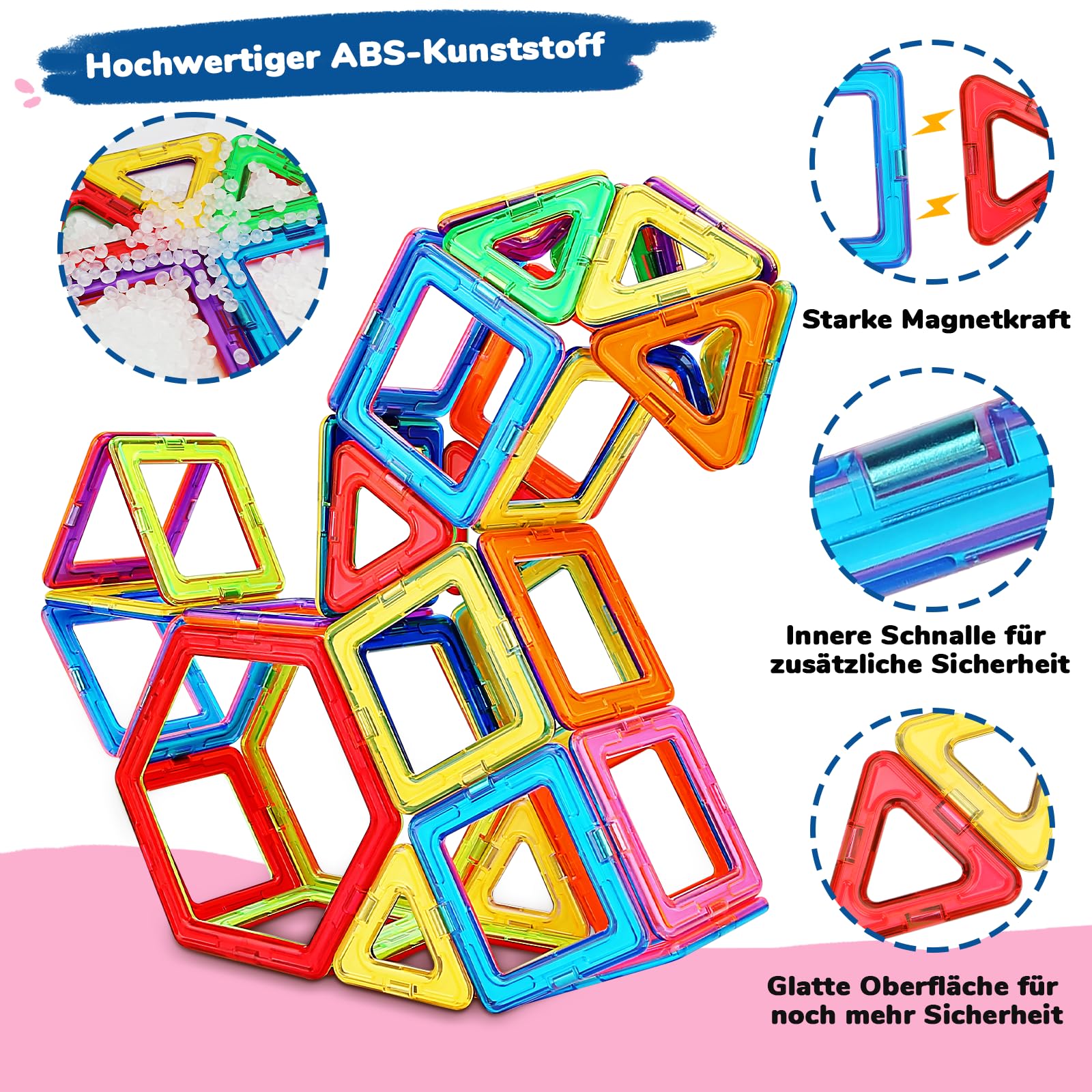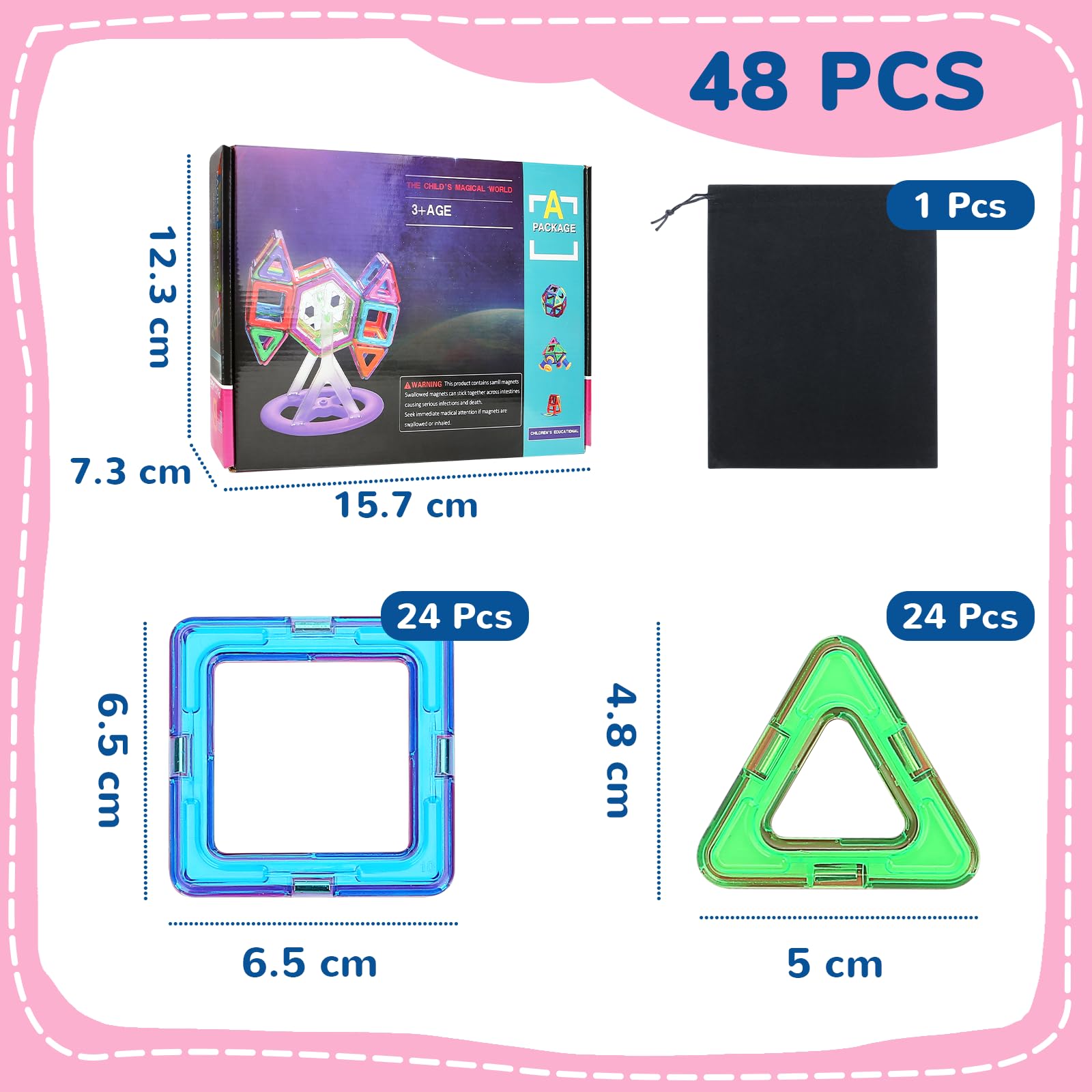 ["Educational STEM Magnetic Building Blocks: This set includes 24 magnetic squares and 24 magnetic triangles, can be combined into many patterns to stimulate children's imagination, creativity, social skills, and minds. Great STEM toy for boys and girls aged 3+ years","Safe for Children: The magnetic construction toys for kids are made of high-quality and safe ABS material. Smooth surface, rounded edges without burrs, more suitable for children's skin and safety. The magnets are firmly adsorbed through an ultrasonic welding process to ensure durability","Educational Toy: Your child can play with these magnetic building blocks and 3D figures and understand the principles of magnets through feeling the magnetic force. Children will enhance their kinetic intelligence, coordination, and problem-solving skills while playing","Screen-Free Play: Our magnetic blocks are engaging and entertaining, keeping children away from screens. A great toy to play with friends or parents, it promotes communication and collaboration and strengthens relationships","Suitable for Various Age Groups: Suitable for children of different ages and learning needs, it is a perfect educational and learning gift for children aged 3 years and older. Customizable for various occasions, including home, school, kindergarten, and educational construction, promoting children's development"]