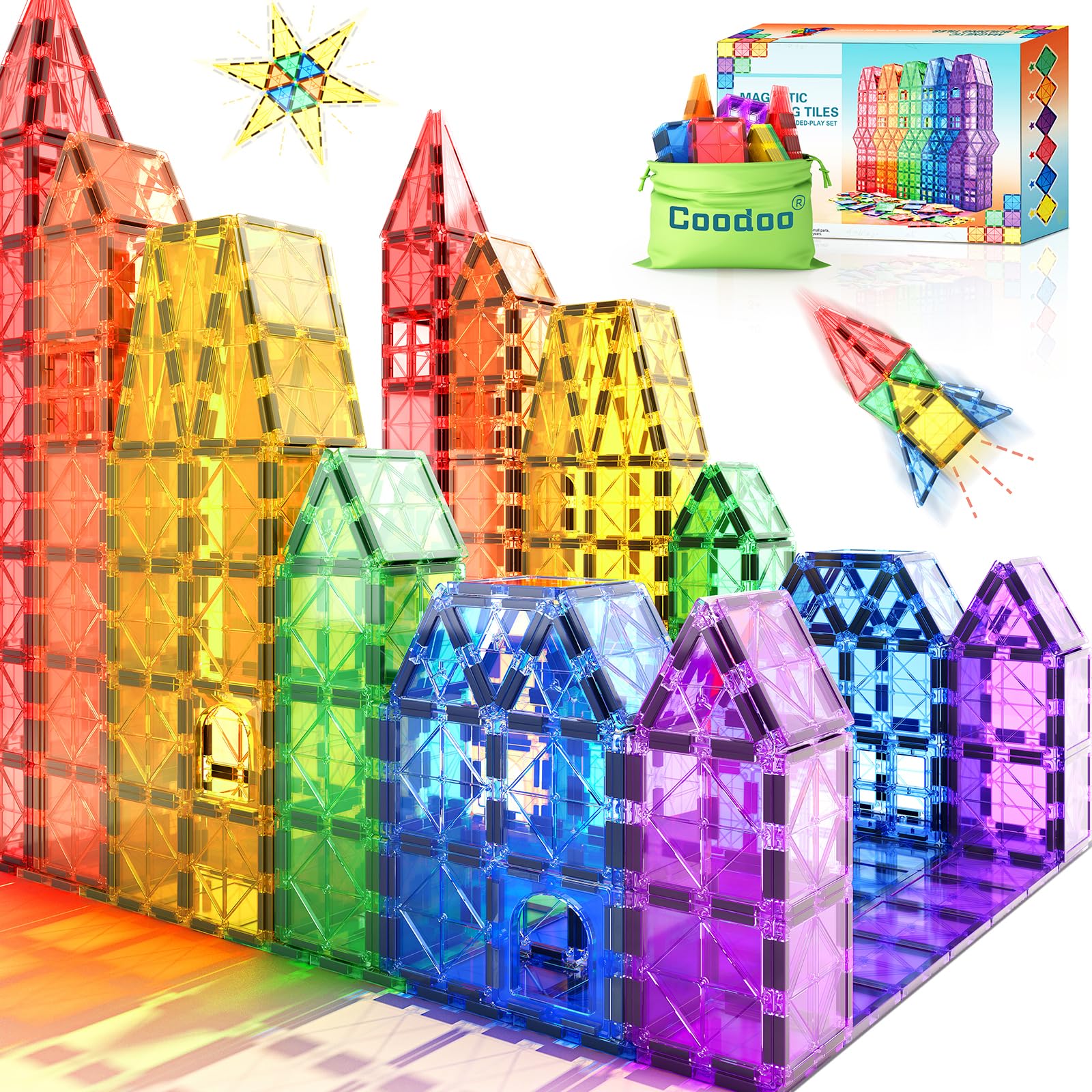 ["Great starter sets with magnetic tiles: Promote learning and creativity of STEM with the Coodoo Magnetic Tiles Starter Pack. This pack includes 40 magnetic tiles in a variety of shapes and rainbow colors. It's the perfect option to start your magnetic tile collection, build big, and gain confidence in the magnetic tile game. A carrying bag is included for easy, stress-free storage. It also allows kids to easily take the learning tiles from room to room","Compatible with leading brands: Coodoo's magnetic tiles have a 3-inch base measurement. They are the perfect size for small hands to grip, pick up, and place shapes. Standard sizes make it compatible with other leading brands. You can expand and complement your existing tiles with this pack to collect every shape in every color. More tiles, more fun","STEM MONTESSORI & SENSORY TOYS - Magnetic tiles are an open-ended toy that grows with your child. They are more than just for building. While having fun and being creative, kids also use magnetic tiles to develop STEM-related skills such as pattern recognition, magnetic principles, problem solving, etc. These tiles also make great sensory toys for enhanced sensory play. What are you waiting for? Get Coodoo Magnetic Tiles today and explore all the different uses","Safety first: Safety is and always will be our top priority. Coodoo's magnetic tiles are made of safe and durable food-grade ABS plastic. Smooth surface and round edge design that won't scratch or harm small hands. The magnet blocks are sealed to prevent the tiles from breaking or being swallowed. With a cross-fix design, our tiles are stronger and less likely to tear than other tiles, so they will last for years","PERFECT LEARNING TOY GIFTS - Perfect for collaborative group activities or school classrooms, preschool classrooms, kindergarten classrooms, outdoor toys, and teacher supply classrooms. Can be connected unlimitedly to stimulate children's creativity. In a word, it is a fantastic children's toy for toddlers, preschoolers, school-age children, even teenage boys and girls like it. Perfect holiday children's toys for birthdays, Children's Day, kindergarten, graduation gifts, Christmas, etc." ]