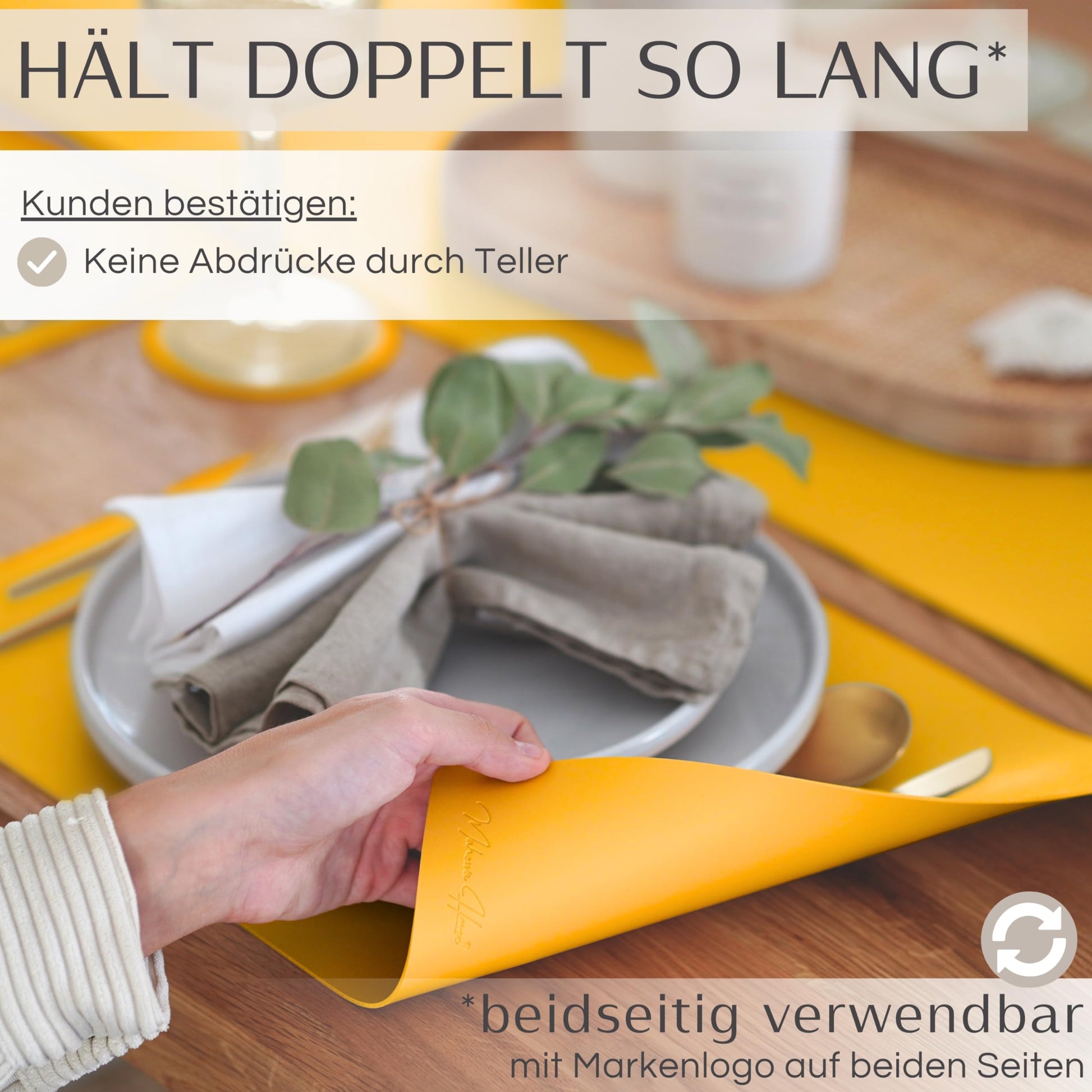 ["🔄 REVERSIBLE: Thanks to the precise embossing of our brand emblem on both sides, the placemat can be flexibly used on both sides without compromising on quality or appearance.","🌱 NATURALLY VEGAN: Our placemats are made of high-quality, durable faux leather - completely free of animal ingredients and thus the vegan alternative for your dining table.","💧 EASY CLEANING: The plate mats are waterproof and dirt-repellent. Dirt can be easily wiped off with a damp cloth, keeping your dining mats clean at all times.","🛡️ FURNITURE PROTECTION: Protect your glass table or wooden table from scratches! Our table coasters provide effective protection and give your dining table a stylish touch.","🇩🇪 OUR PROMISE: We are a German brand based in the Black Forest and place great value on your satisfaction. If returned within 30 days, you will receive a full refund."]