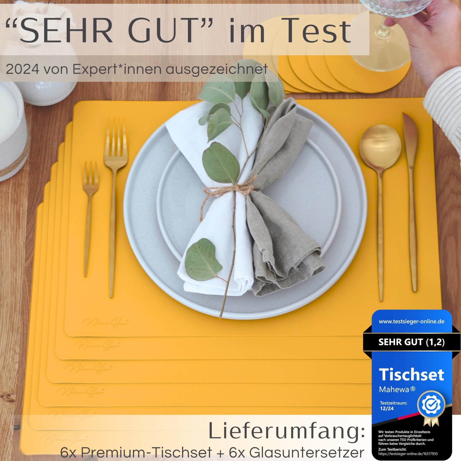 Mahewa® 6-piece Premium Faux Leather Placemat Set - Waterproof and Washable Place Mat Coasters in Leather Look (Mustard Yellow, Square)