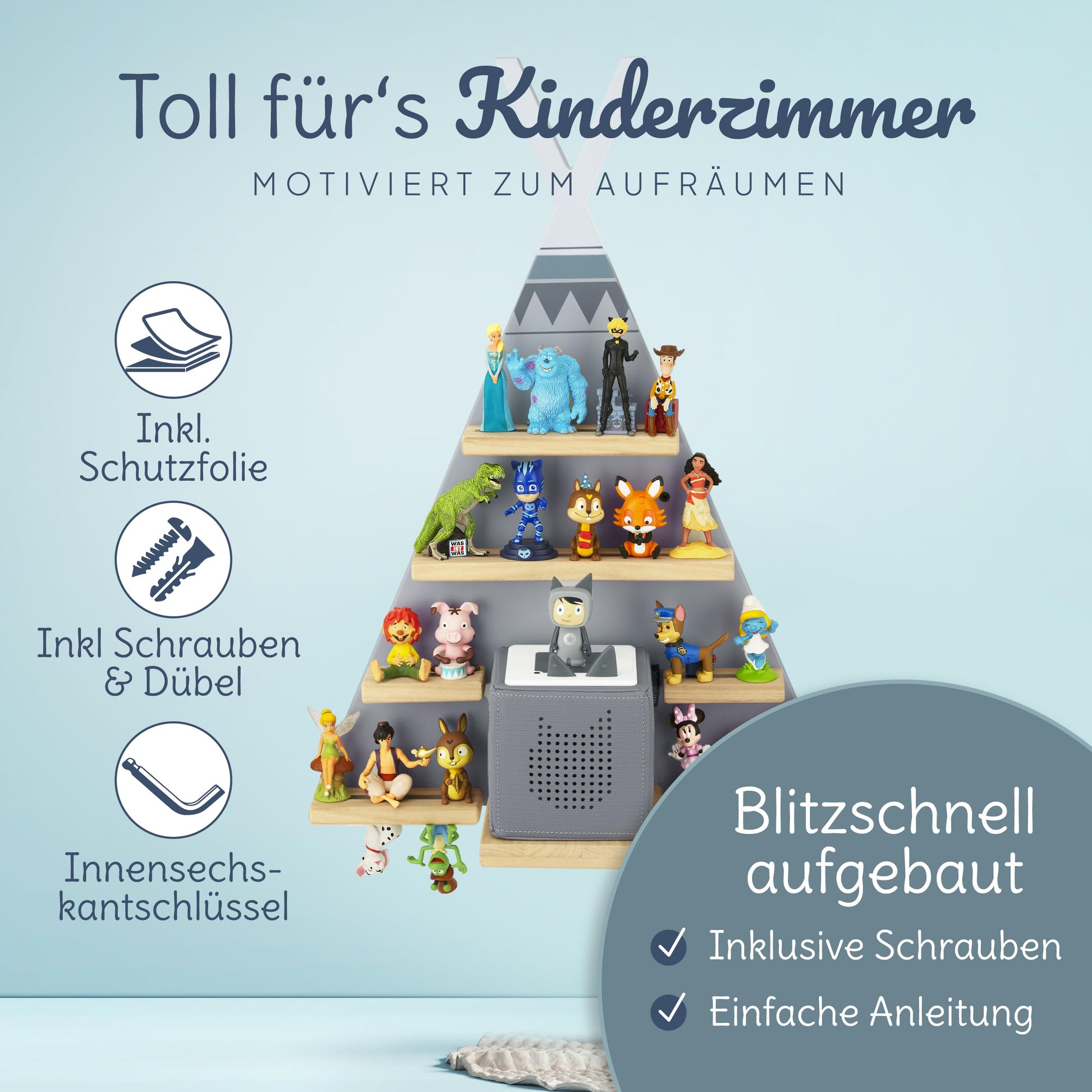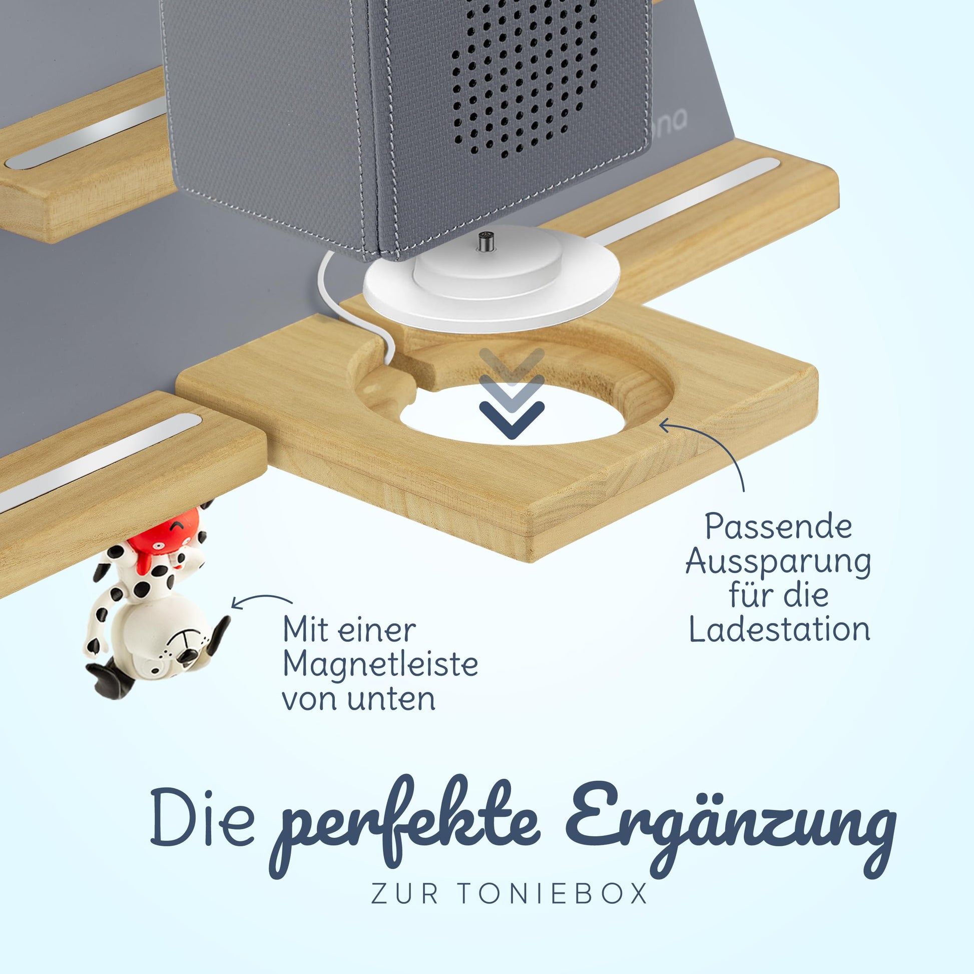["ORGANIZATION, DESIGN & STORAGE: Keep your Tonie figures safely and neatly stored with our practical Tonie shelf. The modern design fits perfectly with your Toniebox and provides space for Tonie figures for boys and girls.","MAGNETIC & STURDY: Our Tonie shelf is magnetic and ensures that your Tonie figures stay securely in place. The stable construction ensures safe storage of your Toniebox and Tonie audio figures.","COMPATIBILITY & FIT: Our Tonie shelf is specially designed for the Toniebox and offers a perfect fit. It is compatible with various Tonie figures and provides ample space for your collection.","SUSTAINABLE & SAFE: Our Tonie shelf is made of high-quality materials and is environmentally friendly. It provides safe storage for your Toniebox and Tonie figures, so you don't have to worry.","YOUNG COMPANY FROM THE RHEINGAU: We stand for quality and passion in the field of children's products. If you are ever not satisfied, our support team always ensures a suitable solution. With us, you choose not only excellent products, but also warm and competent service!"]