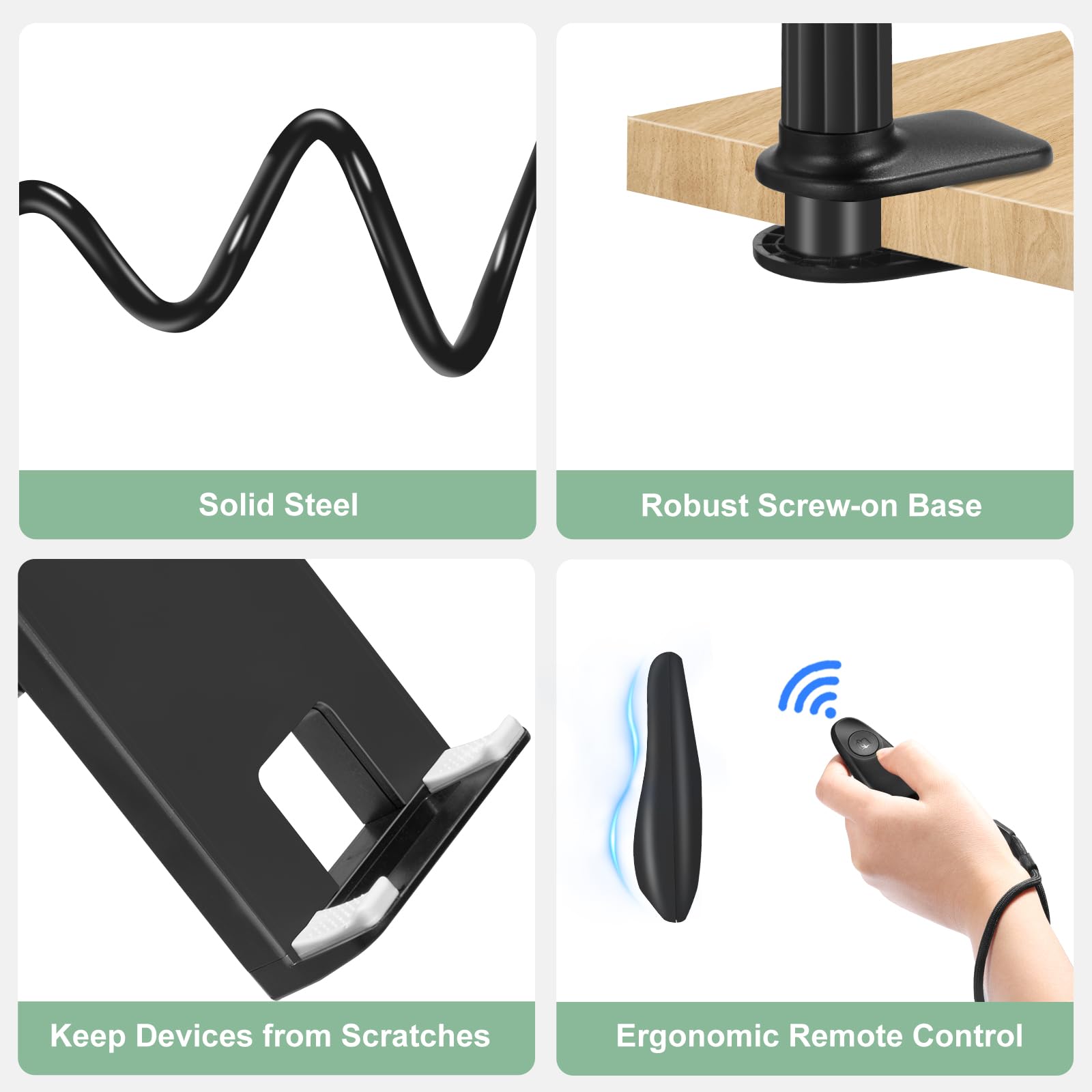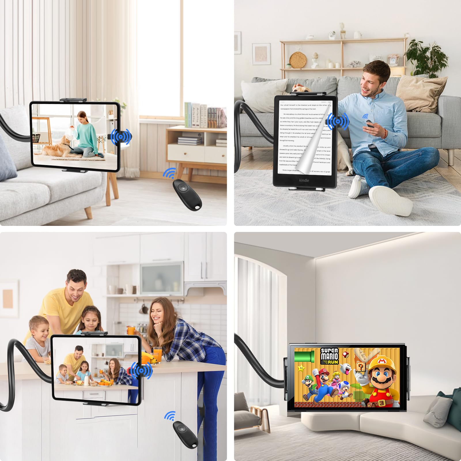 ["Multifunctional"] This tablet holder with remote control for page turning is not only great for reading but also for other purposes. You can place your PS5 on the stand to keep your fingers relaxed. With the remote control for page turning, you can also control your smartphone/tablet to take photos/videos remotely. Buy it and love it!