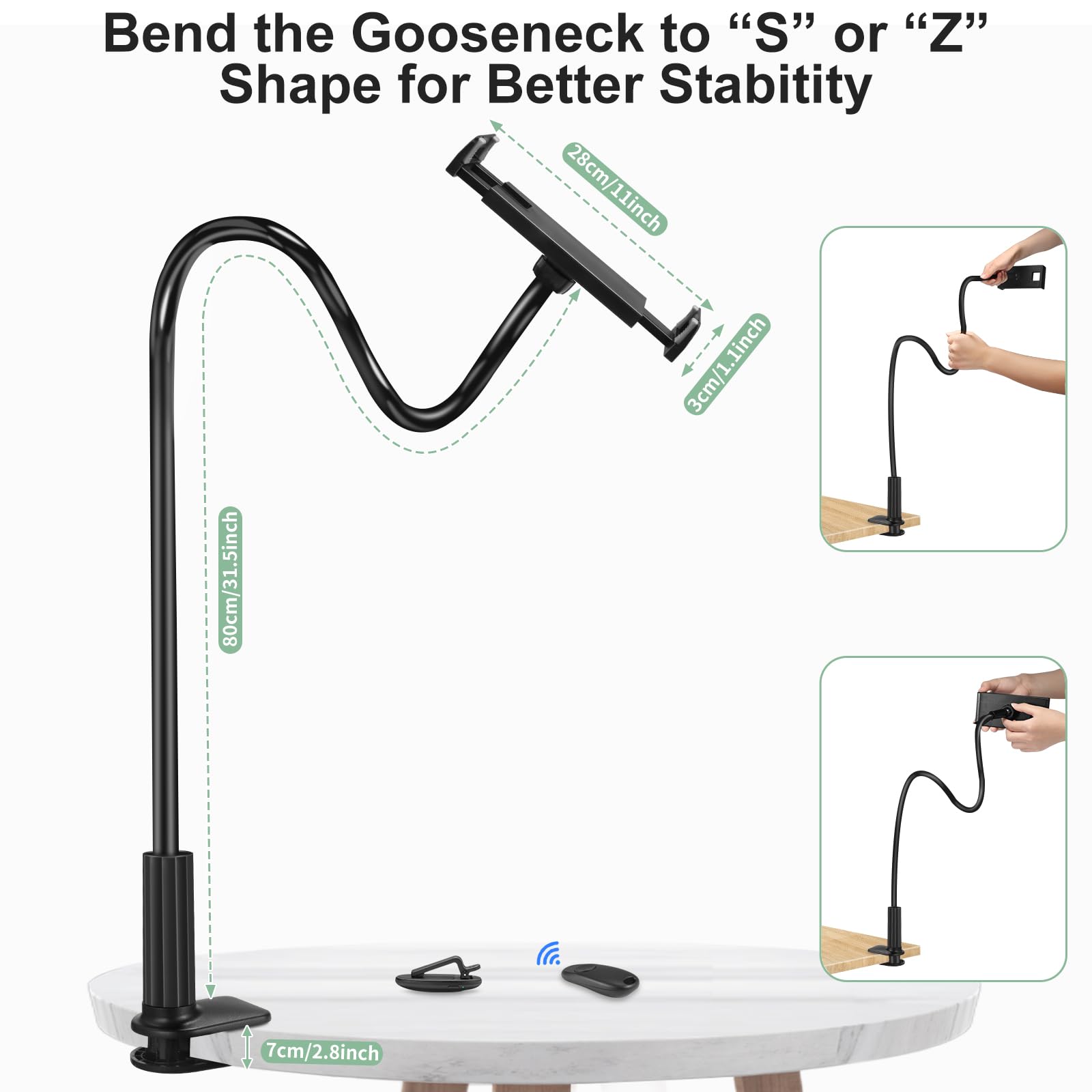 ["Surprise Gift"] This tablet stand with remote control for page turning makes a great gift idea. The package includes: 1* swan-neck tablet stand, 1* page-turning clip, 1* remote control, 1* storage bag, 1* wrist strap, 1* charging cable, 1* user manual, and 1* packaging box. Surprise your family and friends with this cool Kindle accessory set!