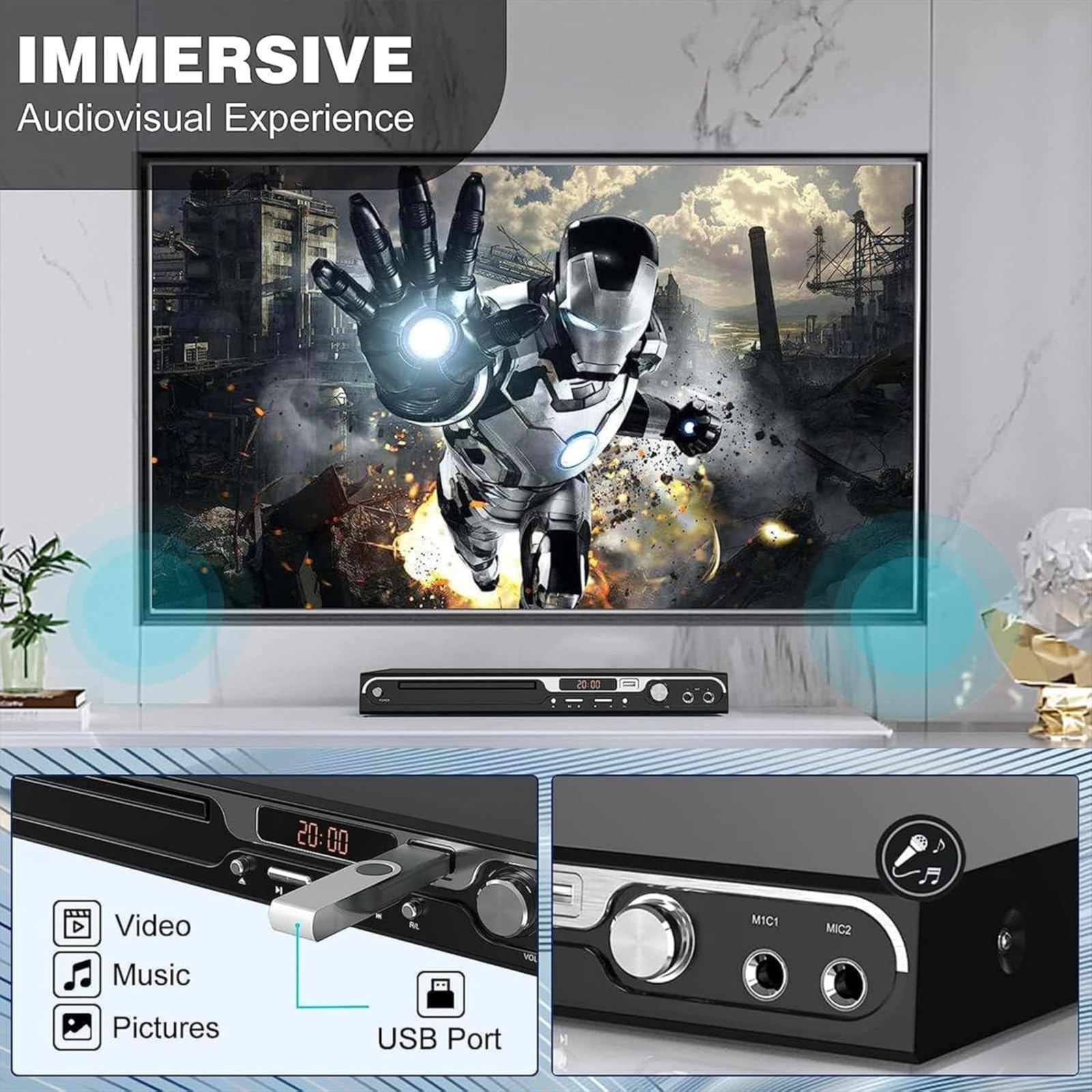 ["Unique metal design】The front of our HDMI DVD player is designed like a European arched door. The metal frame is silver-white and bright, and the body is beautifully black. It perfectly matches modern furniture, bringing beauty and good quality home. The metal control buttons are all on the front, along with mechanically structured knobs that can control the volume well, making it very convenient to use. ["More fun】Our Maite DVD player is equipped with a high-precision and stable laser disc loader. DVDs can therefore be read easily, with error correction function included. DVDs from all regions can be played smoothly. The dual microphone inputs are modernly designed and developed, ensuring surround sound with higher quality. You can sing karaoke or watch movies at home with your friends. ["Plug and Play】The Maite PROS DVD player has been expanded with a USB card reader function. With this premium DVD player, you can quickly transfer and consistently play USB. Video formats: AVI (Xvid, MPEG-1) MPG, DAT, VOB, Audio formats: ASF, WMA, MPEG-(MP3, MP2, MP1) ["Hearing is believing, seeing is believing】The improved chip processor is able to perceive color changes, combined with amazing contrast ratio, making all bright and dark images more vivid and realistic. High dynamic range image processing ensures stable image output. When watching sports or action movies, you will have an intense experience. Easy connection to projectors, conventional or Smart TVs via RCA and HDMI cables. ["Scope of delivery】1 HD DVD player, 1 remote control (batteries not included), 1 HDMI cable, 1 RCA cable, 1 user manual. Bubble wrap for the protection of the TV-DVD player is provided, replacement remote control is free of charge, one-month return policy is allowed, professional customer service is always available. If you need technical support or have any questions, please contact us by email and we will provide a response within."]