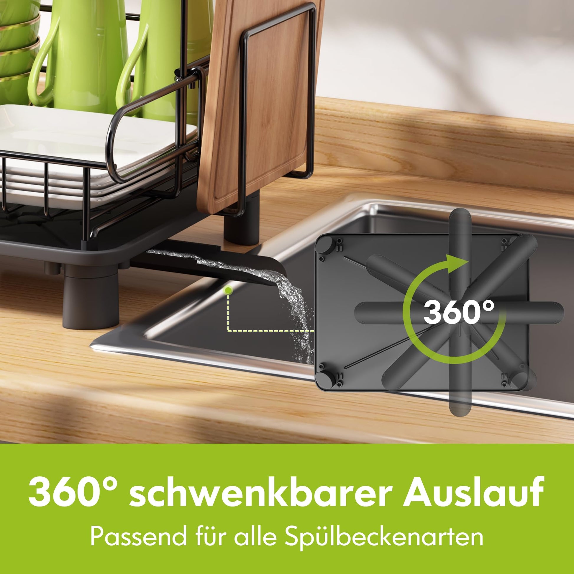 ["Save 80% space: Our double dish dryers and accessories take up less space on your countertop and can hold more dishes than a traditional dish dryer. It is very spacious and can accommodate a variety of kitchen utensils", "270 Swivel Drainage and Telescopic - Our dish drying rack is equipped with an automatic draining tray, saving you from manually pouring water daily, which is more convenient and easier! The innovative swivel spout rotates 270 degrees and can be extended to direct water into the sink, keeping the countertop dry", "Sturdy and durable dish holder - Our dish holders are made of thick and durable stainless steel. High strength, no deformation, environmental protection, safety, and durability. Three layers of O-coating, no loss of color, no fading, corrosion resistance. The dish holder is smooth and scratch-resistant to prevent hand injuries or scratches on the cups", "Easy to Install and Clean - The countertop dish rack is simple in structure and easy to install. No tools are required for installation, simply assemble. You can easily clean it by rinsing it under the tap. The drying rack is sturdy and durable, capable of holding up to 110 kg. Kitchen dish holders are an ideal gift for family and friends", "2-tier dish drying rack with drain tray rack: de dicat, de zones, folplets, powers, and-utten-sears. Stedifrem Preventz Tipping - This drains, tips, everything, Upsitlet, Andsekur"]