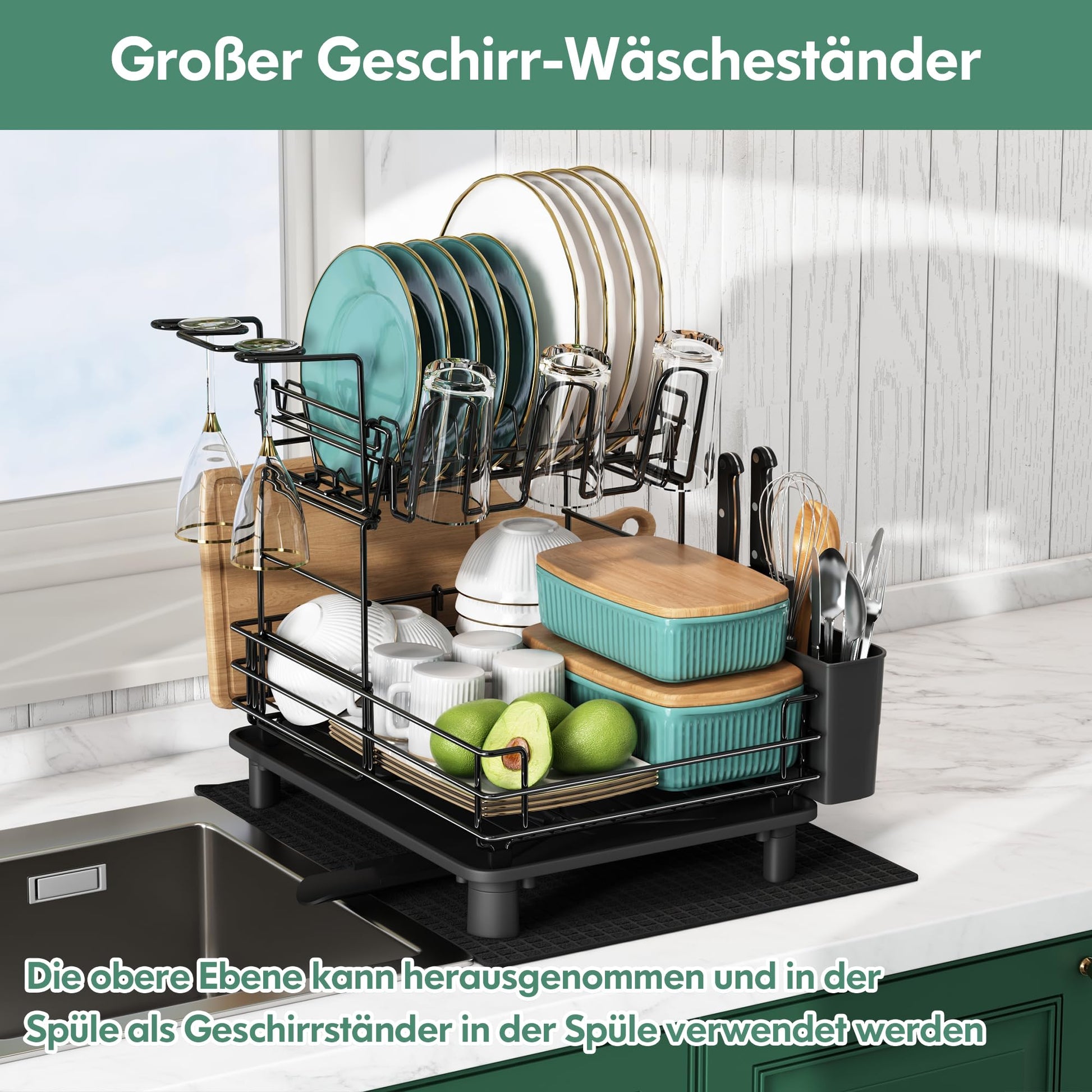 "Multipurpose and space-saving design: Our two-tier dish drying rack is not just a dish dryer, but a comprehensive kitchen organizer. It is designed to save valuable space on the countertop and make your kitchen look neat and spacious. Thanks to the two-tier design, you can dry more dishes, plates, cups, and bowls at the same time, increasing the efficiency of your kitchen."