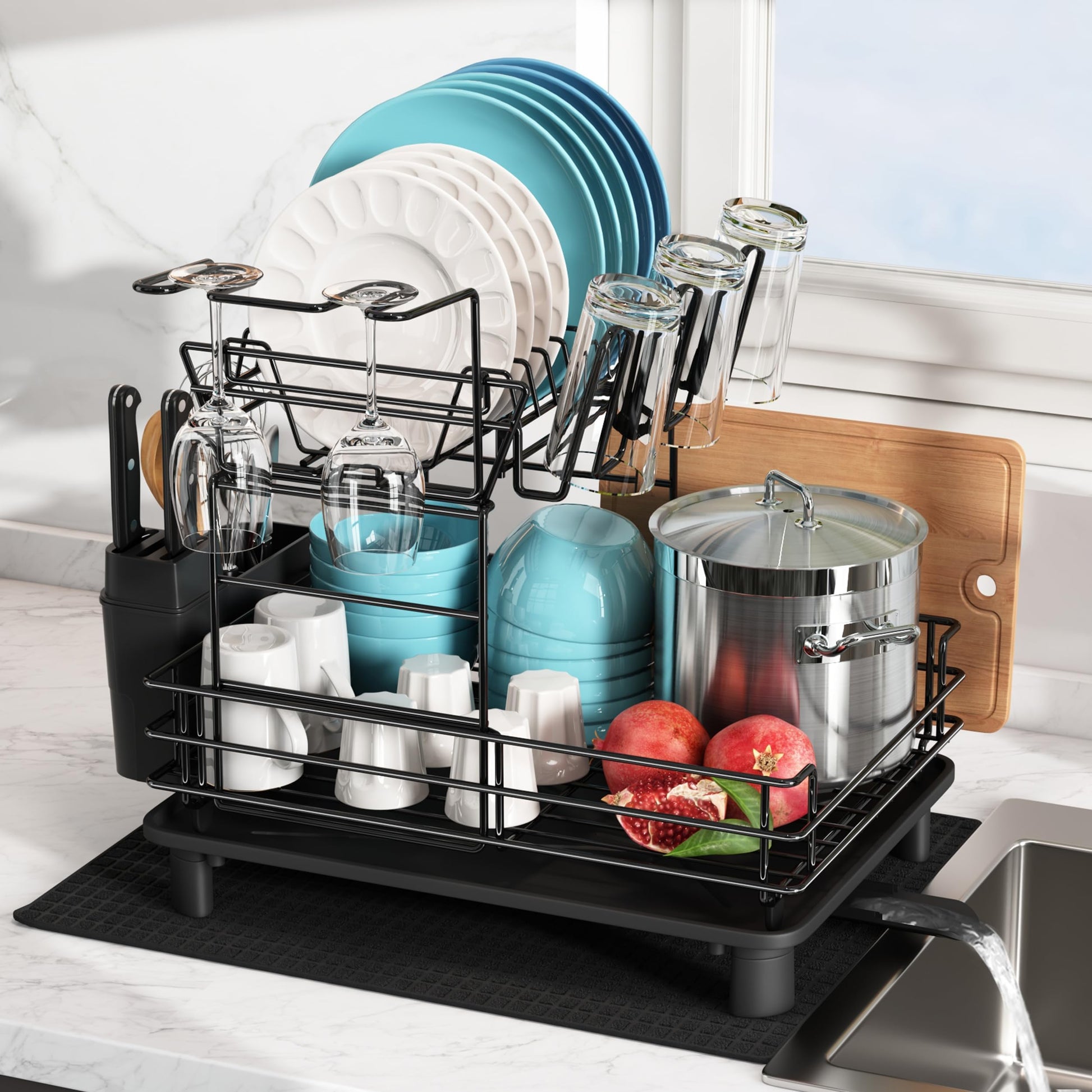 MAJALiS Dish Drying Rack, 2-tier stainless steel dish drying rack with drip tray and drying mat, dish rack with utensil holder, dish dryer for kitchen counter, black.