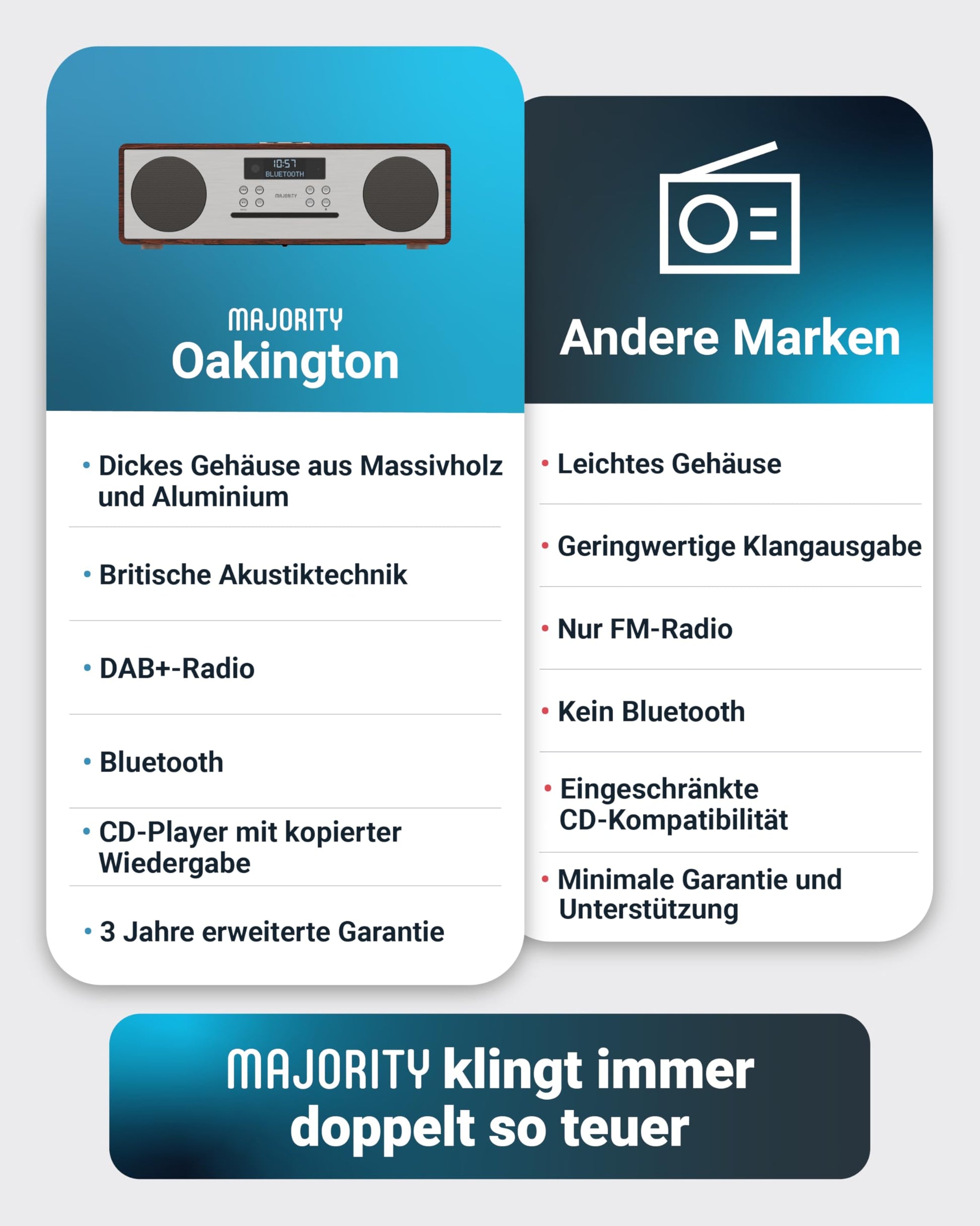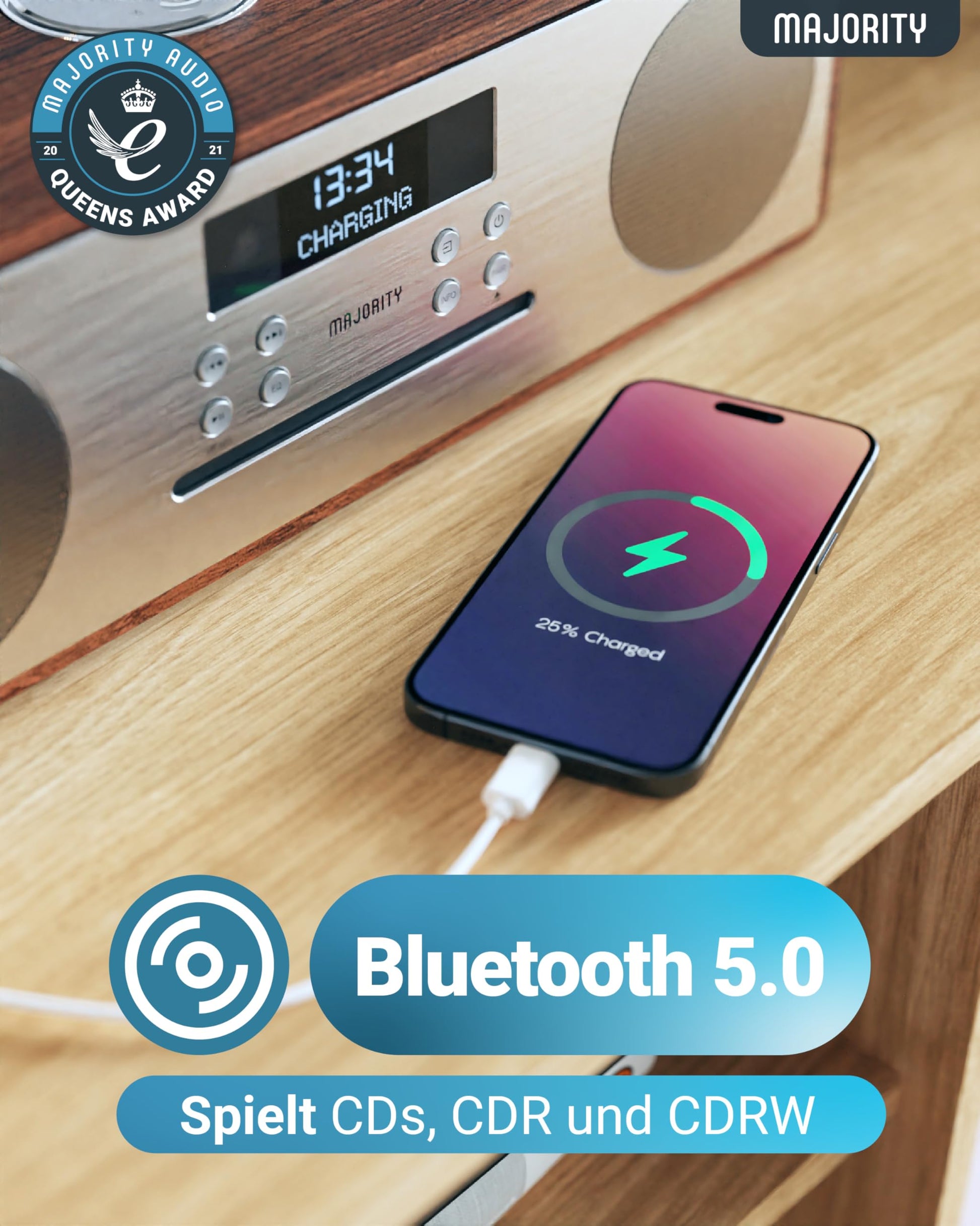 Majority Oakington DAB & FM CD player and digital radio compact system with Bluetooth speaker. HiFi system with dual USB input/charging, AUX/USB, DAB radio, and CD stereo system.