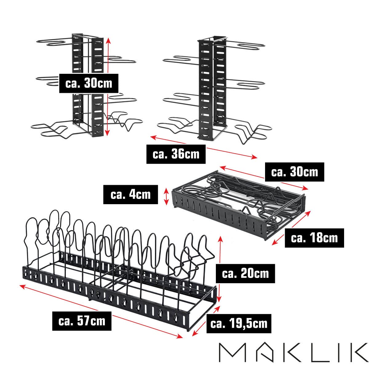 ["WITH ONE GRAB THE RIGHT PAN - You will never have to empty the whole drawer again to find the right pot: The organizer for pans, pots & pot lids puts an end to chaos in the cupboard.","FLEXIBLY ADJUSTABLE FROM 12-22 INCHES - For kitchen cabinets and drawers with approximately 7.5 inches minimum height. The sturdy stand consists of 2 shelves that slide into each other. Plus: 12 dividers for inserting.","STORAGE WITHOUT SCRATCHES - Because stacking is history! The robust shelf made of powder-coated steel can hold up to 22 lbs: Ideal for cast iron lids, as pan holder and plate stand.","FINALLY ORDER IN THE KITCHEN - Not only as a pot rack & lid holder - also as a dish drainer for plates, cooking pot and casserole dish at the sink. Folded, the kitchen shelf is very small: Approx. 12x7.5x2.5 inches.","STORAGE WITHOUT MOISTURE - For breakfast boards, cutting boards & everything made of wood: Organizational system in black - 11 compartments with adjustable partition - minimum 0.8 inches spacing - approx. 12-22 x 7.7 x 7.3 inches."]
