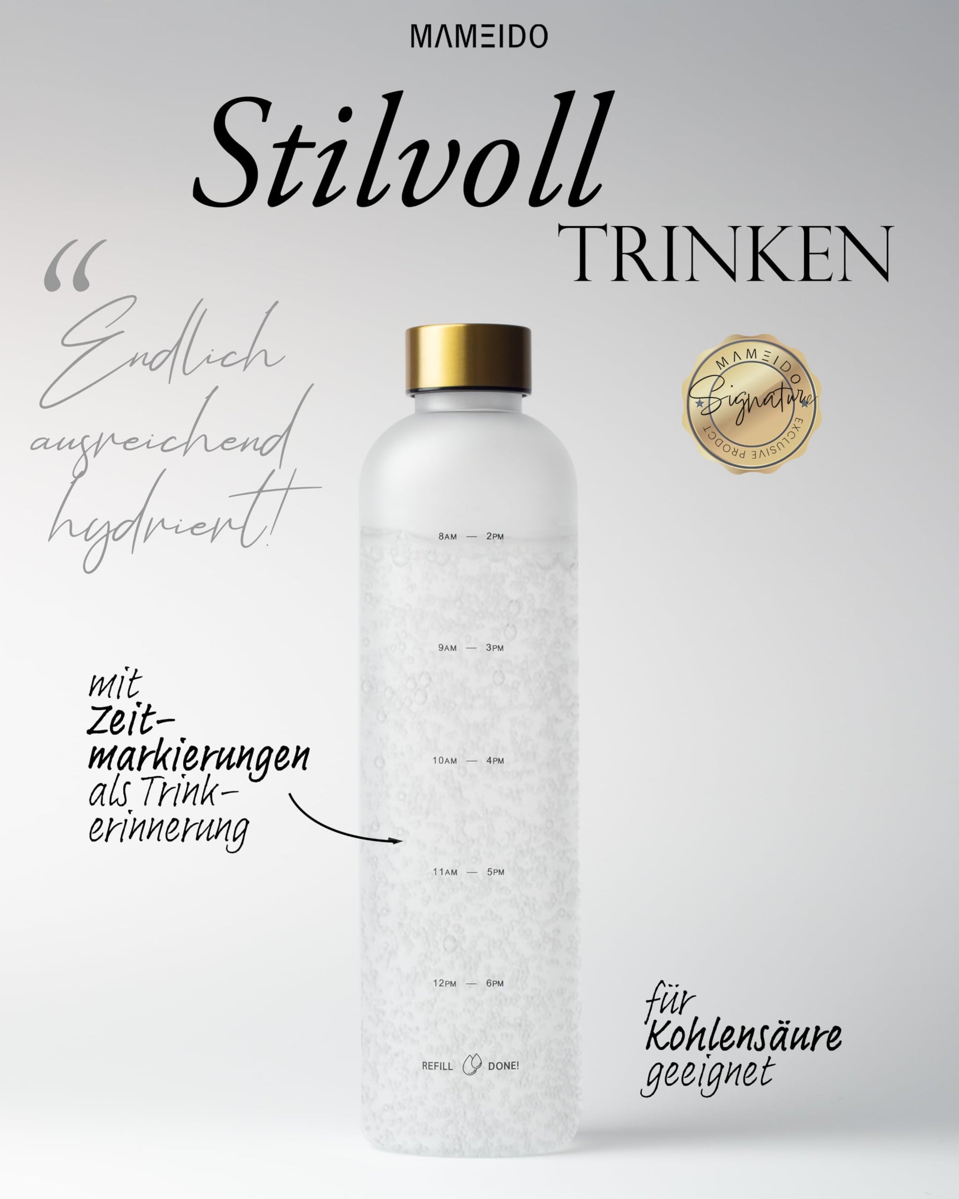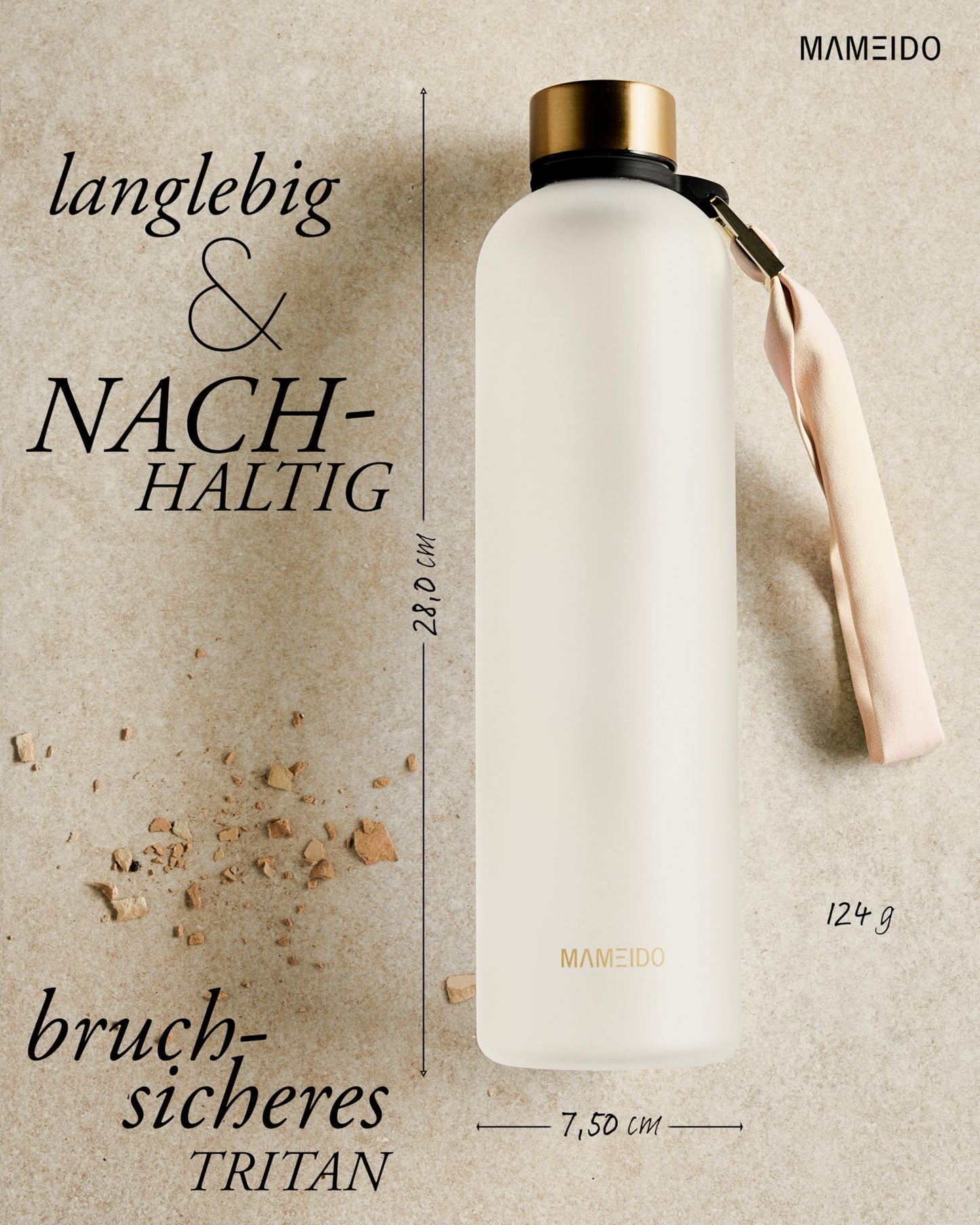 MAMEIDO 1L carbonation-friendly water bottle with leak-proof design, time markings, BPA-free for sports, gym & office (Frosted White Gold)