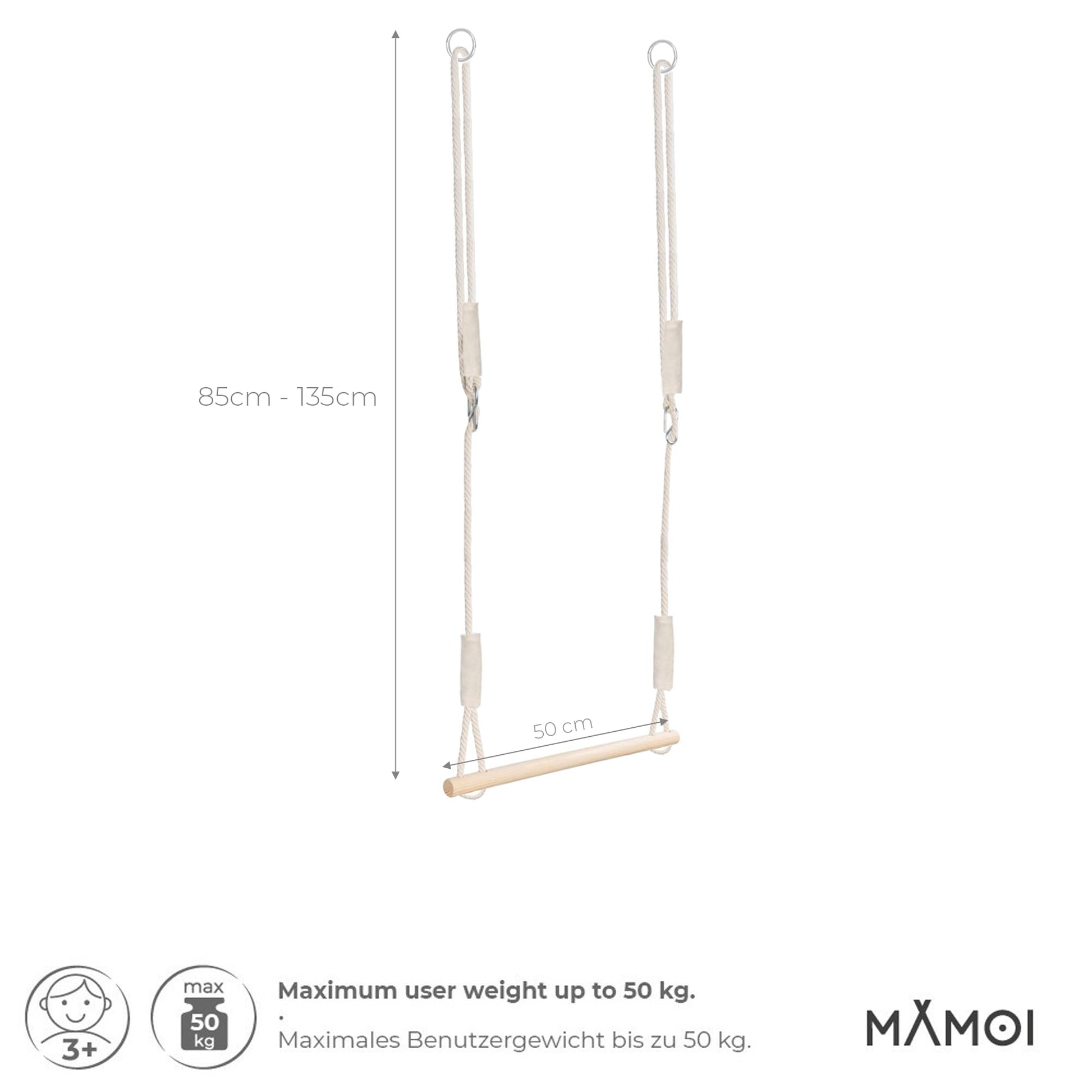MAMOI® Trapeze swing, wooden gymnastic rings, kids' indoor and outdoor exercise equipment, ring swing, wooden swing set, gymnastic rings, and trapeze bar.