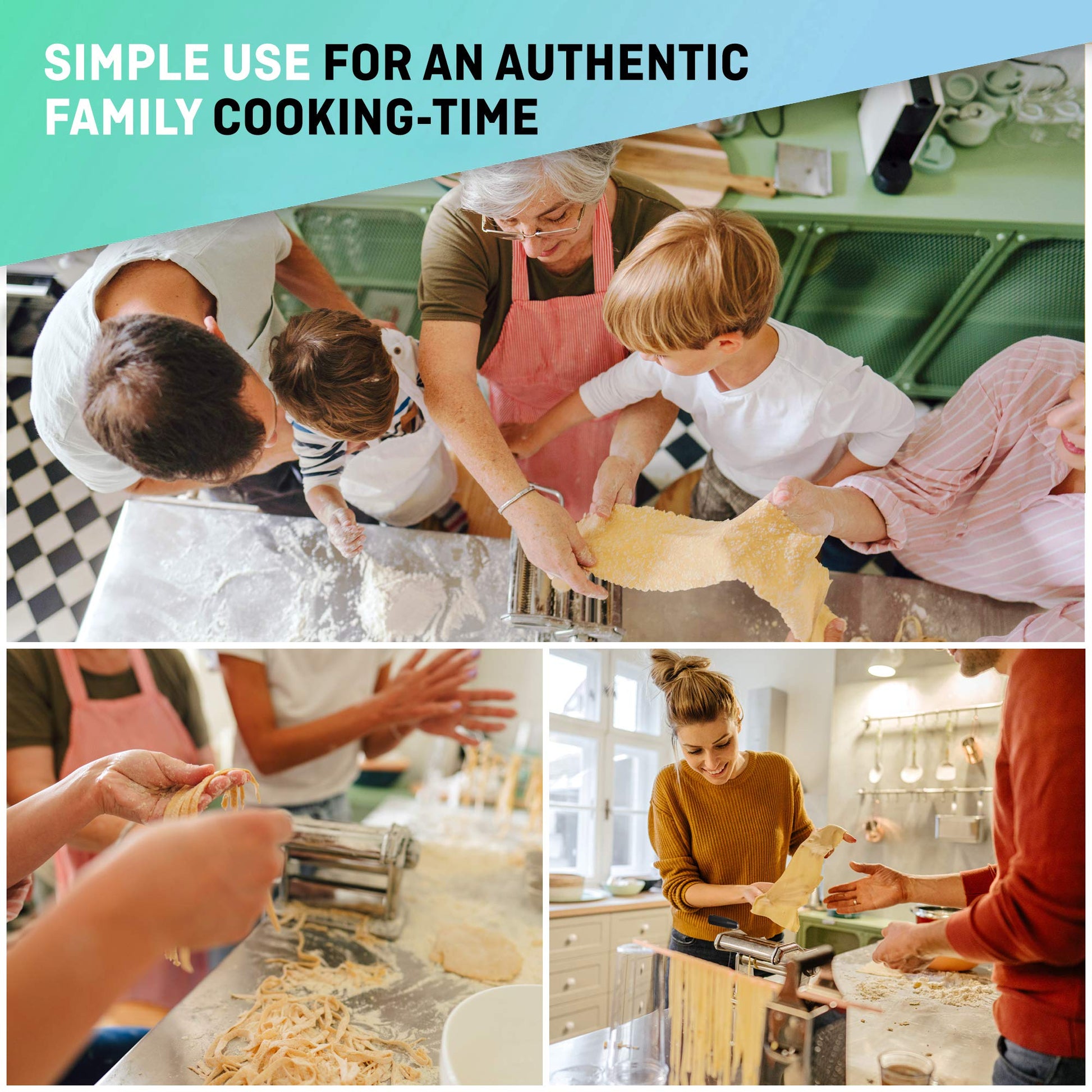 "TIMELESS DESIGN & VERSATILE USAGE: The pasta machine made of high-quality stainless steel with chrome and nickel plated rollers will be your reliable kitchen companion for years to come. This pasta machine simplifies the process of making noodles and allows you to enjoy fresh lasagna, tagliatelle, fettuccine, tagliolini at home in a traditional Italian way. You can now determine the ingredients and nutritional values of the dough. No more bland ready-made noodles from the supermarket.