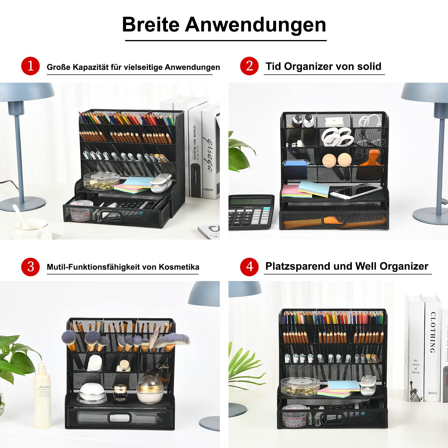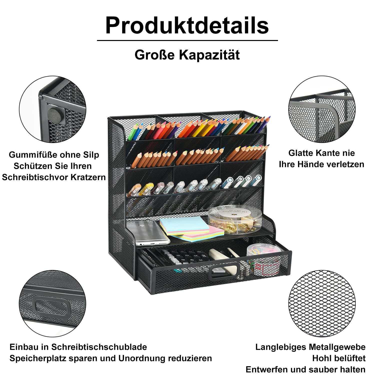 ["Enough Capacity: Set with 9 compartments with a shelf, enough compartments to enable basic organization. Large capacity, multifunctional, helps you keep desk gadgets and stationery clean and tidy. The best and safest storage solution for you. Perfect size: 10.6 x 3.9 x 8.2 inches","Space-saving: This mesh organizer is practical for storing and sorting small items such as pencils, markers, glasses, and so on, helping you save space. Make your desk look neater and cleaner","Versatile Design: This desk caddy is perfect not only for storing your desk stationery like pen, pencil, marker, ruler, eraser, paper clip, scissors, letter opener, and many other desk widgets, but also ideal for storing your makeup brushes, nail polishes, lipsticks, and other small, personal items that are sorted by type, what you need! You can put all other daily necessities in the organizer, it helps you keep your things organized","Sturdy and Durable: The desk storage is made of high-quality metal mesh and equipped with non-slip feet to make it incredibly stable, which does not easily rust, keeping the pen holder like new all the time. The extremely smooth edges will not hurt your items or yourself. For all your home and office requirements","Risk-free Purchase: Ideal for teachers, students, teens, and kids in the school classroom or teacher's desk. We value our customers and hope you will enjoy a pleasant shopping experience. If there is any problem with our products, please contact us without hesitation via email and we will solve the problem as soon as possible"]