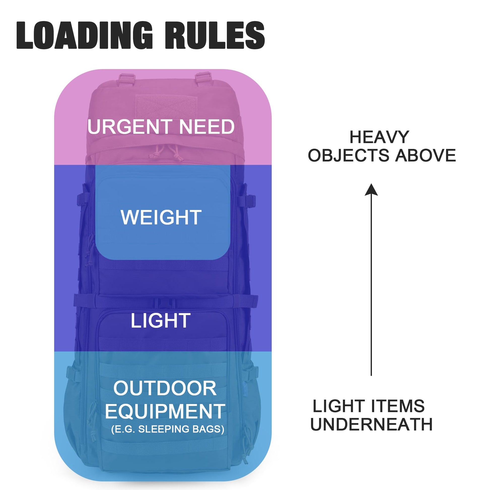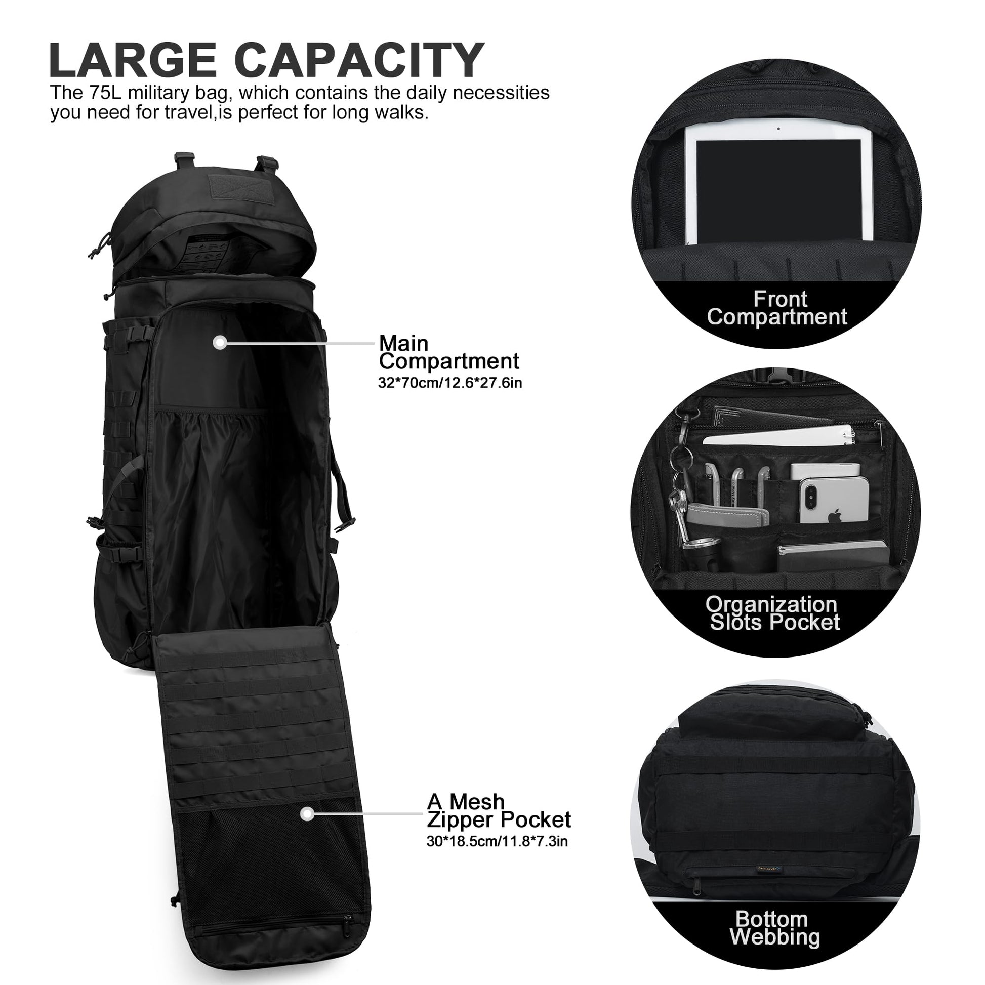 ["High-quality and functional backpack: Our Mardingtop 75L Tactical Backpack offers a large capacity of 75 liters and is perfect for sports enthusiasts. It is durable and easy to care for, providing maximum carrying comfort.","Durable quality and exclusive look: Made of light and weather-resistant polyester, our backpack stands out for its robustness and good workmanship. Thanks to the ergonomically shaped, mesh-padded shoulder straps and the adjustable chest and hip belt, you can customize the backpack to your needs.","Thoughtful structure for optimal organization: The trekking backpack has a spacious main compartment that can be opened and closed 180 degrees. With a convenient 2-way zipper, you have easy access to the contents. The lower zipper pocket has a rain cover to protect your backpack and everything inside from rain.","Flexibility through MOLLE webbing system: The outdoor backpack features an internal MOLLE webbing system where you can attach additional tactical pouches or gear. It also accommodates a hydration system with a 3-liter water bladder (not included).","Versatility and comfort: This military backpack is not only durable but also multifunctional. With its chest straps, it can distribute weight evenly, making it ideal as a 3-5 day assault pack, survival backpack, or daypack. Whether you're hiking, trekking, camping, climbing, or traveling, this backpack will serve you faithfully."]