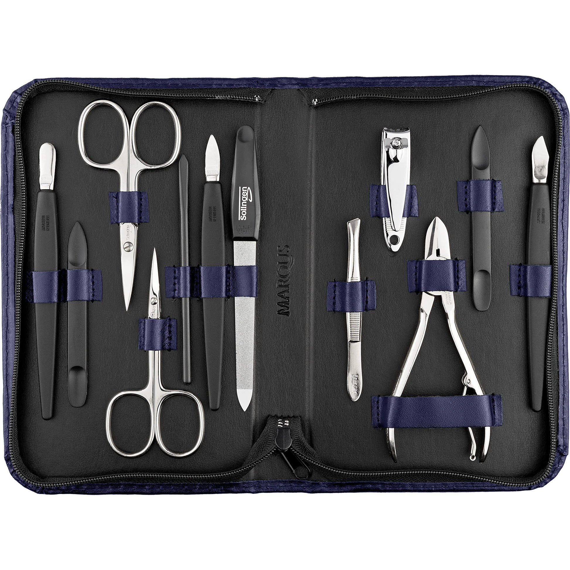 marQus Solingen Mega Manicure Pedicure Set 12 Pieces - Nail kit for men and women with everything you need for nail care, in a high-quality genuine leather case, Dark Blue