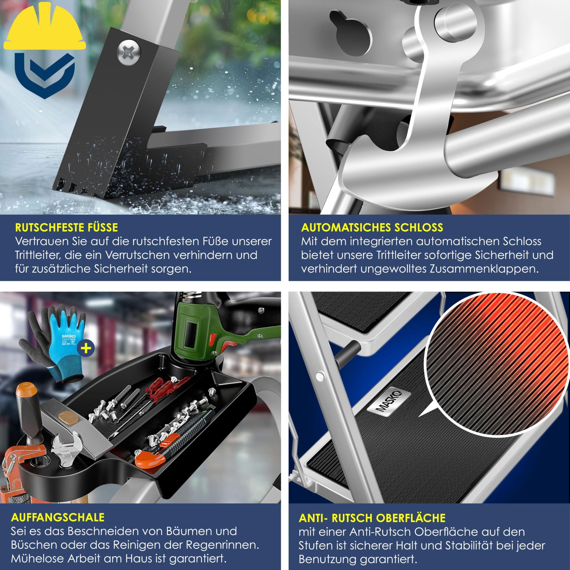 "SICHER UND STABIL: The MASKO Step Ladder offers a sturdy steel construction that supports up to 330 lbs, ensuring maximum safety. Non-slip anti-slip steps and feet provide a secure grip on any surface. The integrated automatic lock prevents accidental folding and provides additional security, allowing you to work safely and stably on any task, whether in the house, garden, workshop, or garage. VERSATILE ASSISTANT: The MASKO Step Ladder is the ideal helper for a variety of tasks in the house, garden, workshop, and garage. It allows safe work in hard-to-reach places, such as changing light bulbs, trimming trees, cleaning gutters, or working on high shelves. With a load capacity of up to 330 lbs, it provides the necessary stability and security for all your projects. PRACTICAL DESIGN: The foldable design of the MASKO Step Ladder allows for easy storage and transportation. It can be stored in tight corners or cabinets, saving space and ready for use when needed. This practical design makes the step ladder an essential tool that takes up little space but is always ready to help you with your tasks. When you purchase the MASKO Step Ladder, you will receive a pair of high-quality work gloves to protect your hands during work. These gloves provide additional comfort and safety by keeping injuries and dirt at bay. With the work gloves, you are well equipped to efficiently, safely, and comfortably perform your tasks, whether indoors or outdoors. WORKSPACE ORGANIZATION: The MASKO Step Ladder features an integrated tray for tools and small parts that significantly simplifies your work. You can keep tools, screws, and other small parts within easy reach, saving you the constant need to climb up and down. This saves time and increases efficiency in performing a variety of tasks, from repairs to decoration projects."