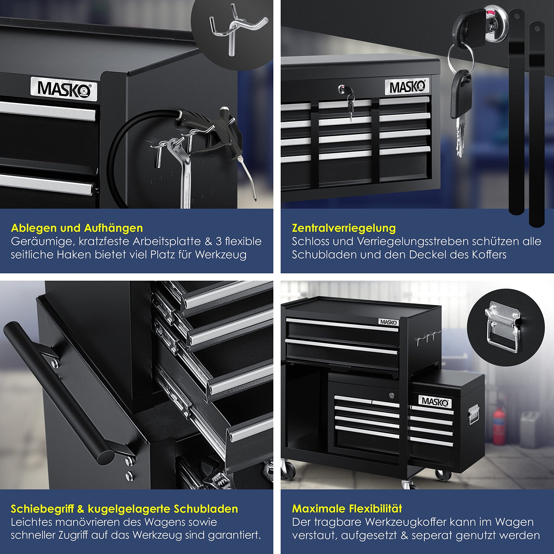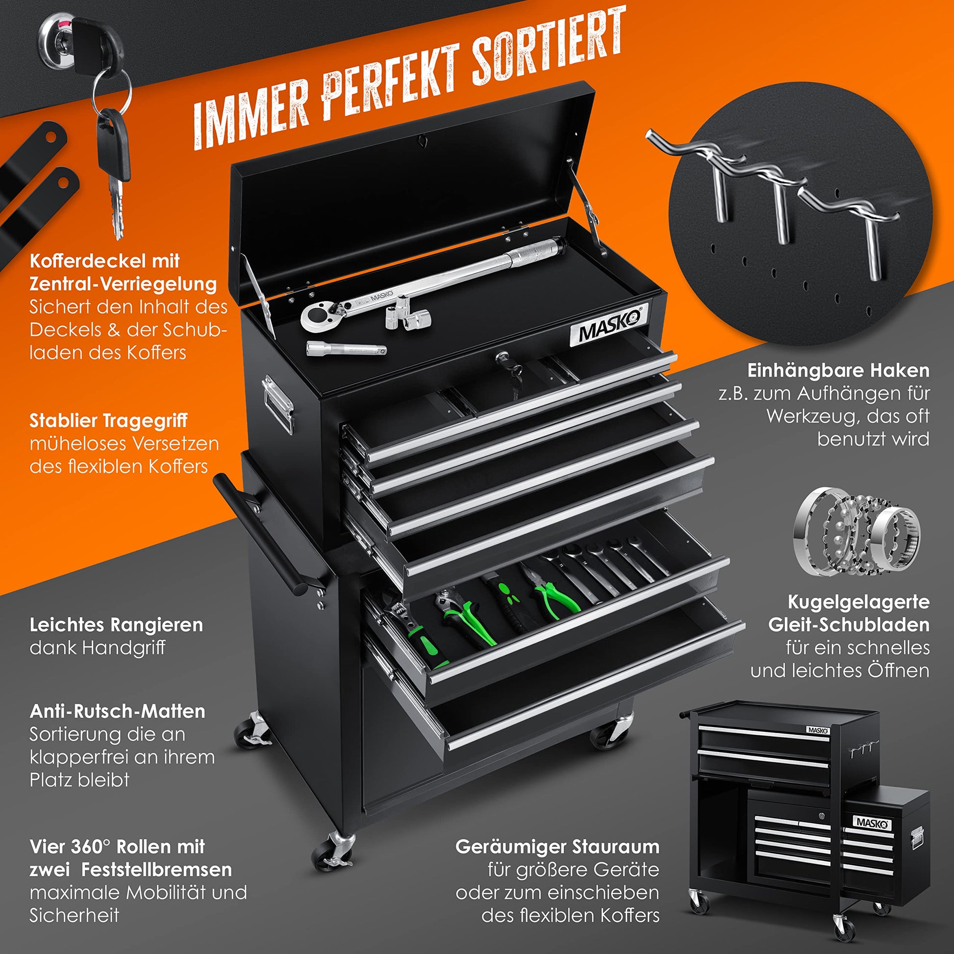 ["IDEALE ORDNUNGSHELD: With the MASKO tool trolley including toolbox, you are not only opting for an optimal organizer, but also for an ideal and efficient sorting of your tools.",