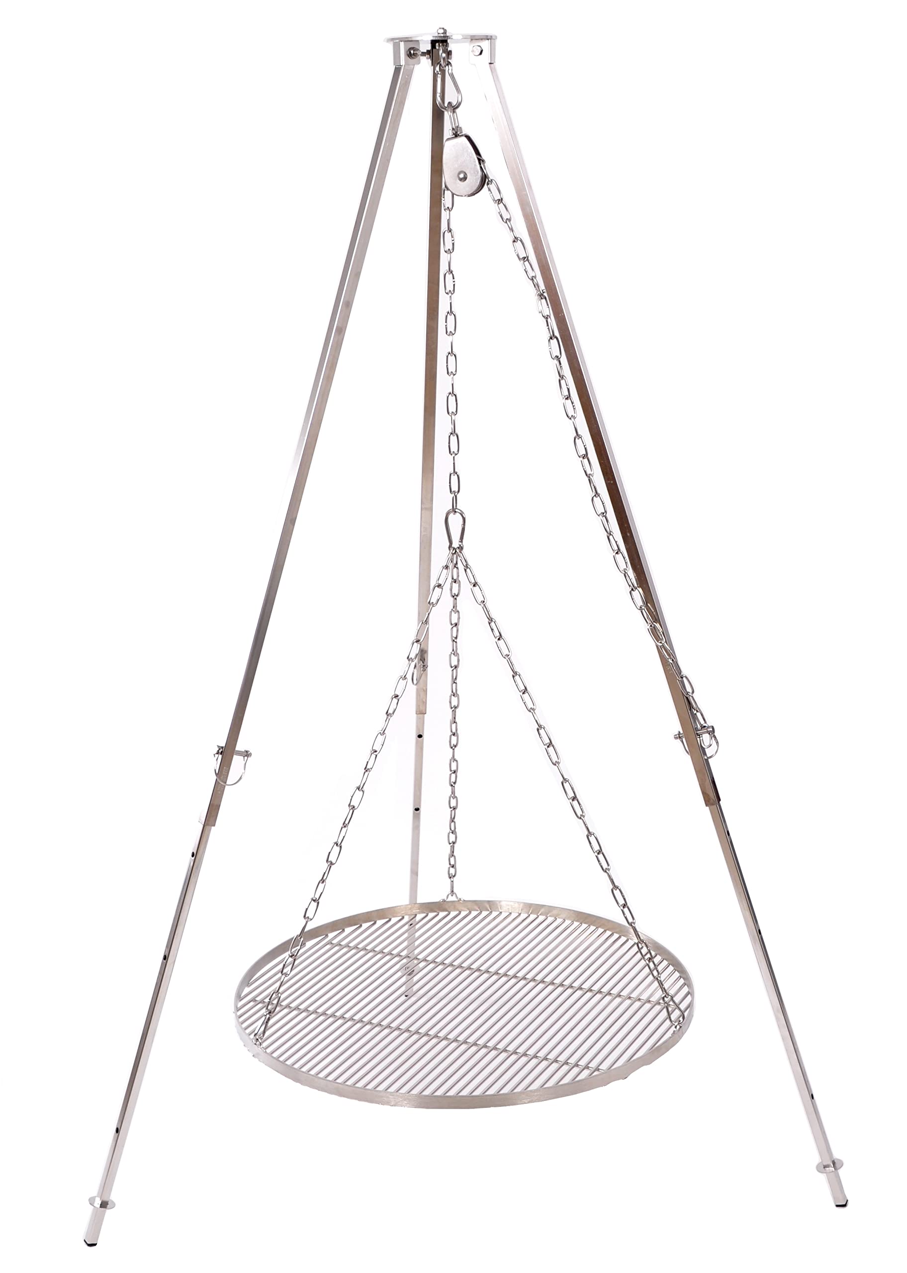"The offer includes a very sturdy tripod made of 304 stainless steel with carrying bag - suitable for use with rotisserie grill and goulash kettle. Fast setup and adjustable in height from 1.10 to 1.80 meters, anti-slip feet - also suitable for use on smooth surfaces - weight 7 kg. Suitable for outdoor, camping, tours, and garden. Chain height adjustment through pulley, 20 mm cross-section of the legs, load capacity up to 50 kg, 1.2 m chain length for hanging - includes carrying bag. The offer includes a stable and solidly constructed tripod - rotisserie grill sold separately."