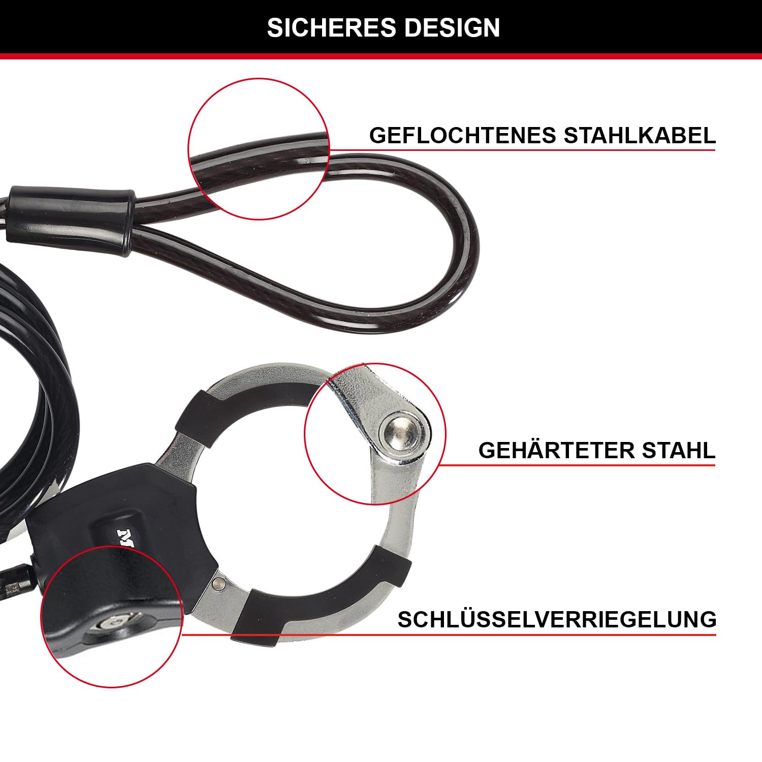 ["APPLICATION: For indoor and outdoor use; the cuffs can be used as a bike lock, electric scooter lock, or stroller lock.","DURABLE DESIGN: The bike lock features a braided steel cable for strength and flexibility, as well as a protective vinyl coating to prevent scratches.","MAXIMUM SECURITY: Pin tumbler locking mechanism and key offer excellent protection against lock picking.","DIMENSIONS: 8mm diameter and 3ft length for convenient locking; Color: black","WARRANTY: If the product fails to perform its intended use due to a material or workmanship defect during its lifetime, it will be repaired or replaced free of charge.","MASTER LOCK: Since 1921, Master Lock has been producing security products in the USA. With a tradition of expertise and innovation, we bring your security up to date with our products. The #1 brand in the USA distributes padlocks, safes, bike locks, security solutions, and more worldwide for residential and professional users."]