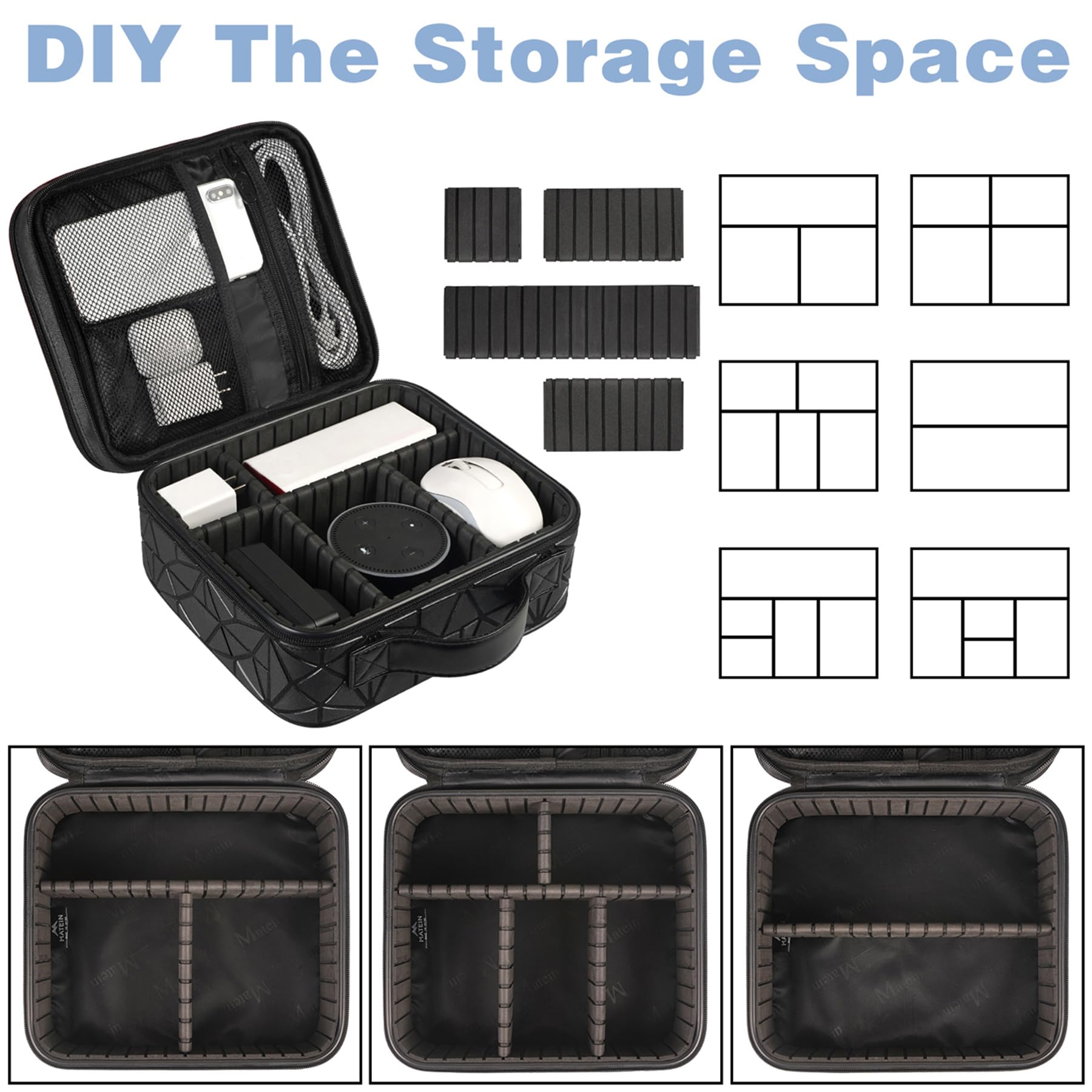 Large Capacity & Hardshell Case: The size of the cable organizer hard case is 25.5*22.5*12cm. In the upper layer, you can store cables, USB sticks, SD cards, and batteries. In the lower pocket, you can store a charger, hard drive, battery, mouse, and other accessories. And the lower layer is a unique hard shell design that prevents the contents of the bag from being crushed by external forces and protects your devices.