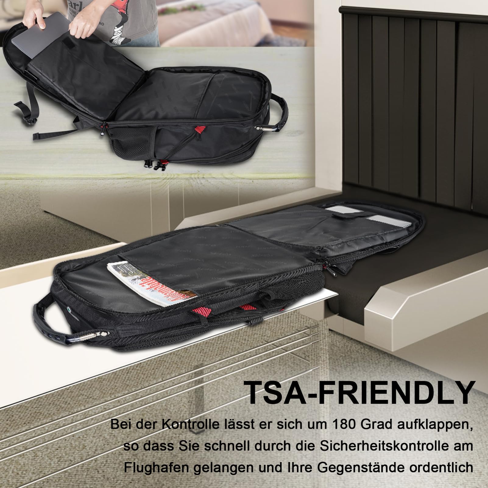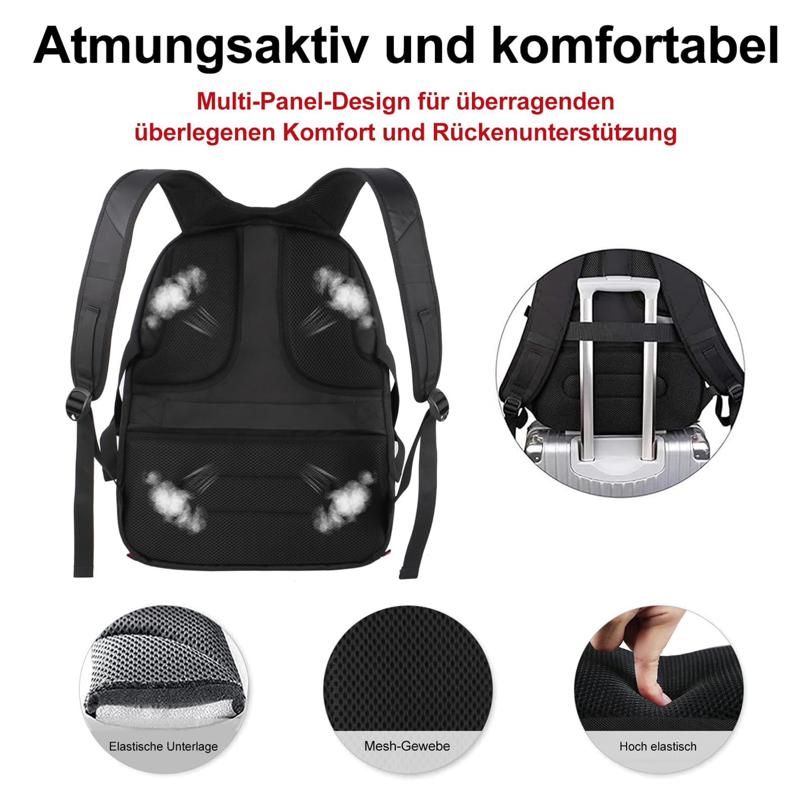 ["Backpack with Multiple Compartments: This large backpack for men features 4 large compartments. The main compartment offers plenty of space for everyday essentials and is ideal as a school or work backpack for men. Interior mesh pockets, also has 2 zippered front compartments with pen pocket and keychain. The backpack is equipped with dual side mesh pockets for bottles and umbrellas, and deep zippered pockets on both sides.","Laptop Backpack Men Waterproof: Large laptop backpack 17 inches made of waterproof durable polyester fabric and high-density nylon lining for higher tear resistance. The backpack top features a two-way zipper for smooth gliding. The large men's work backpack has a sturdy handle on top wrapped in wire rope to increase stability.","TSA-Compatible and Versatile: Large TSA-compliant travel backpack, exclusively designed for air travel. The large men's backpack can open freely from 90 to 180 degrees, allowing you to quickly and easily pass through airport security without removing items from the backpack. Ideal as a travel backpack, school bag for boys, girls, teenagers.","Thick Foam Padding & Wide Shoulder Straps: Wide, comfortable, and breathable mesh shoulder straps and ample foam padding help reduce shoulder pressure. The thick foam padding in the interior compartment protects laptops and other items, and the 3D T-shaped ventilation on the back promotes air convection. The backpack is equipped with a USB charging function and an integrated charging cable.","Functionality and Security: With strong and smooth zippers and well-woven luggage straps, you can conveniently attach the laptop backpack to a luggage cart, making your travels more comfortable anywhere. Ideal for international flights and day trips. This backpack is the best gift for men. Perfect for school, work, travel."]